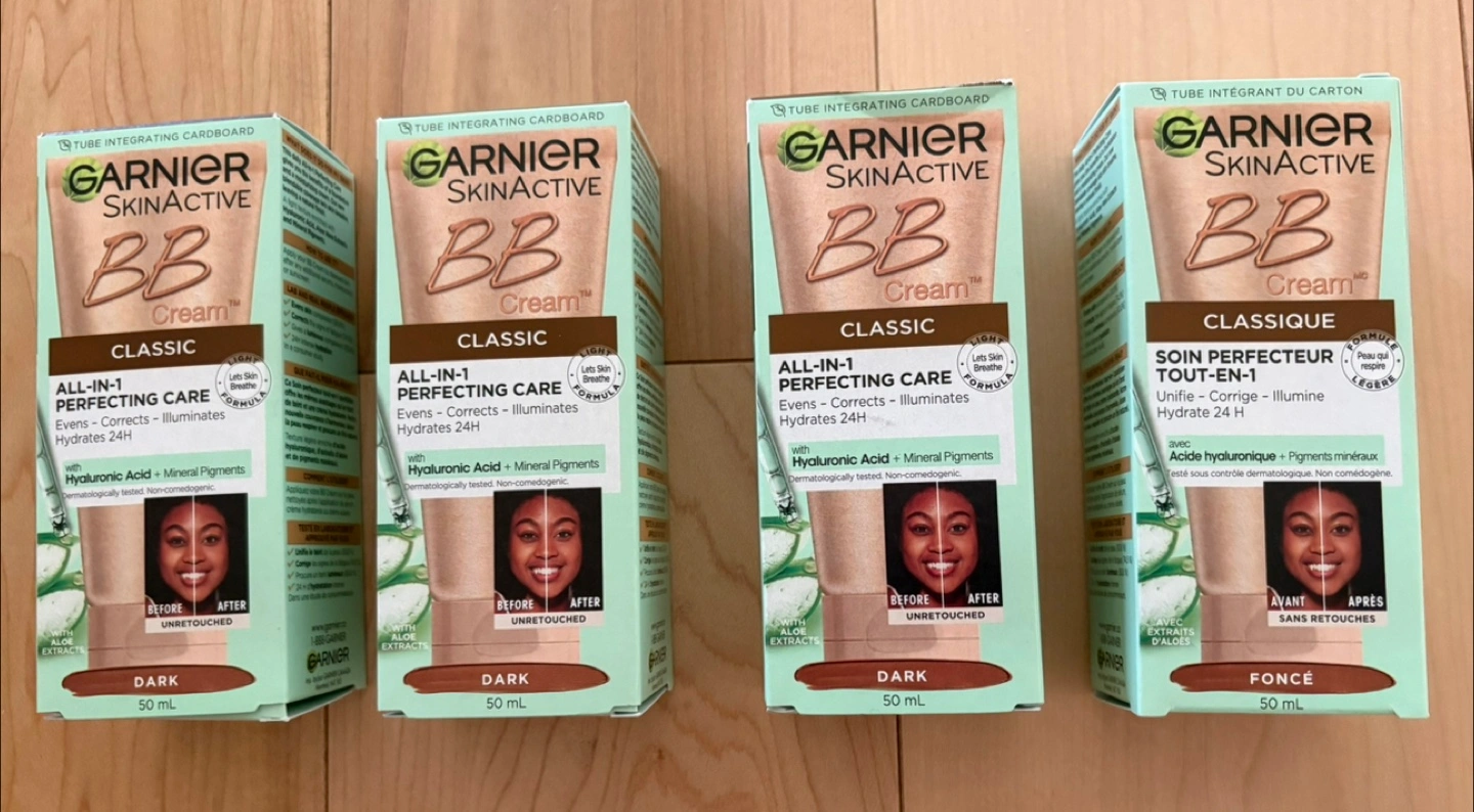 $12 Each Four tubes of Garnier SkinActive BB Cream in the shade Dark. All-in-1 perfecting care. Evens, corrects, illuminates, and hydrates for 24 hours. Contains hyaluronic acid and mineral pigments. Dermatologically tested and non-comedogenic.