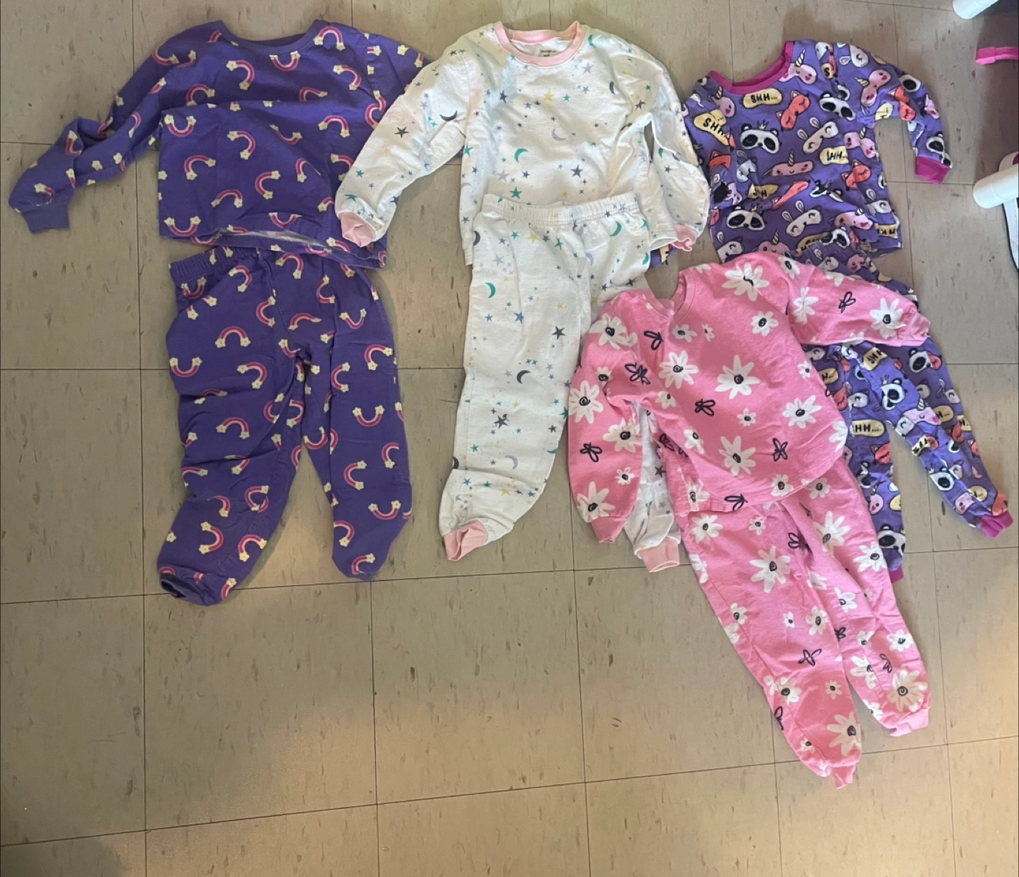 A collection of pajama sets. Several long-sleeved tops. Coordinating bottoms. Bright patterns and colours. Snug fit. These pajamas are perfect for a good night's sleep.