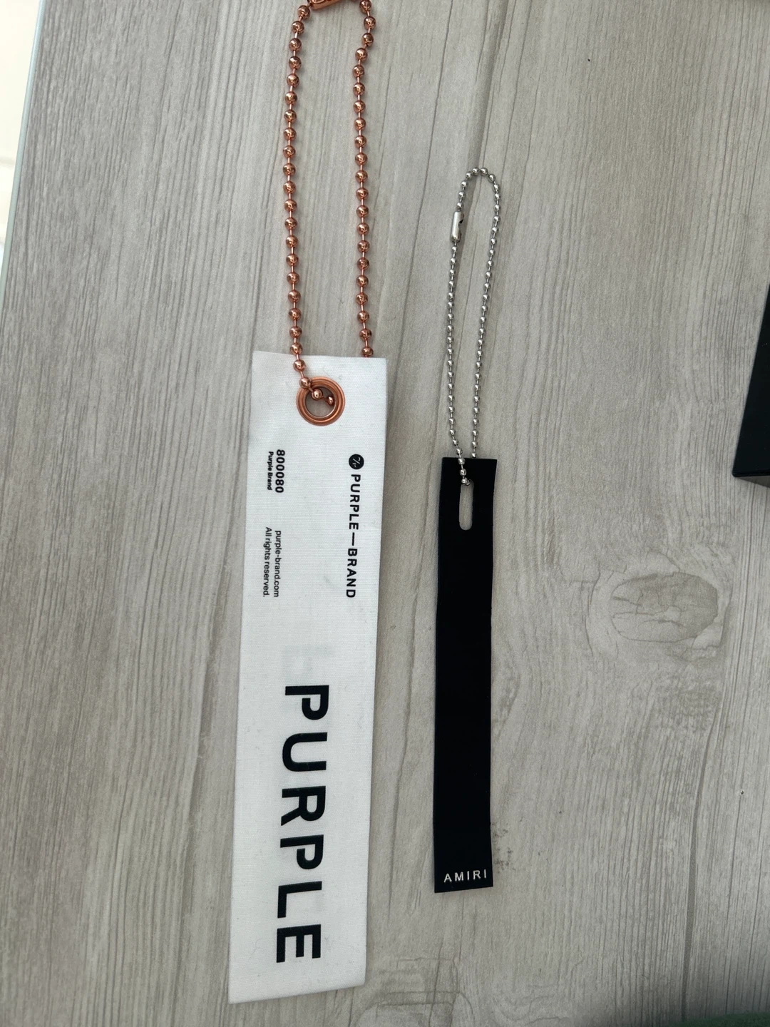 Two bag charms from Purple Brand and Amiri. The Purple Brand charm is white with rose gold ball chain. The Amiri charm is black with a silver ball chain.