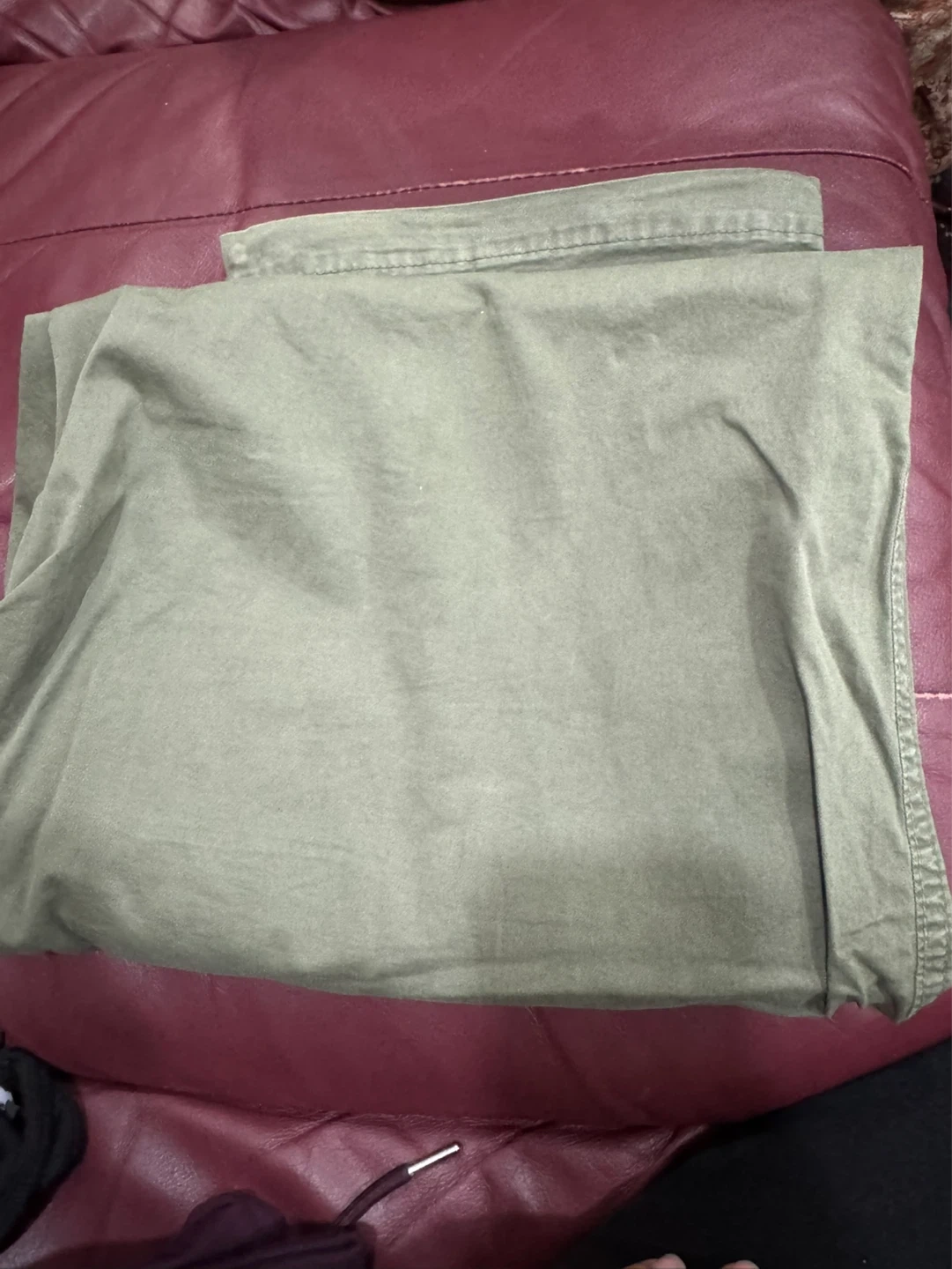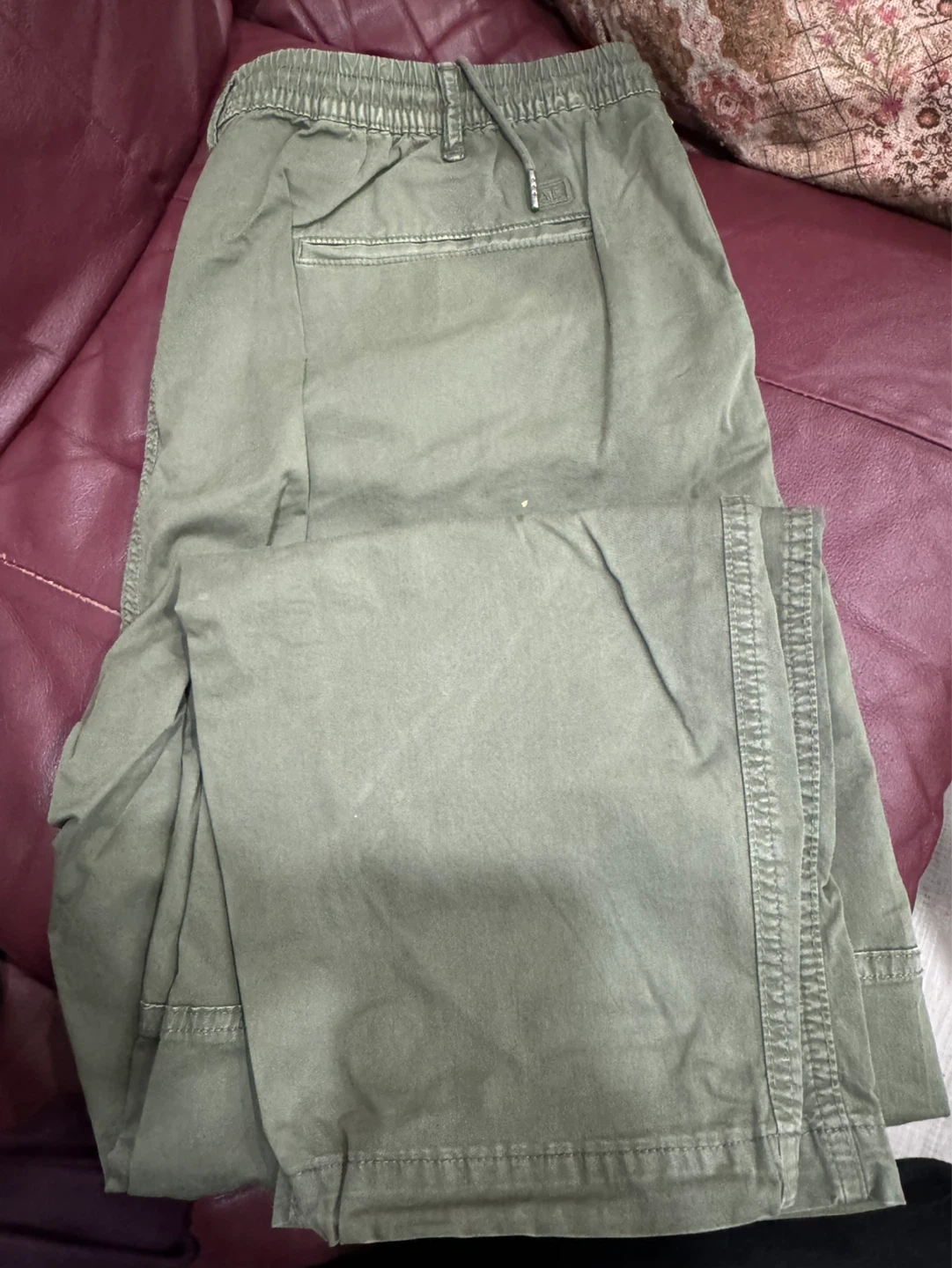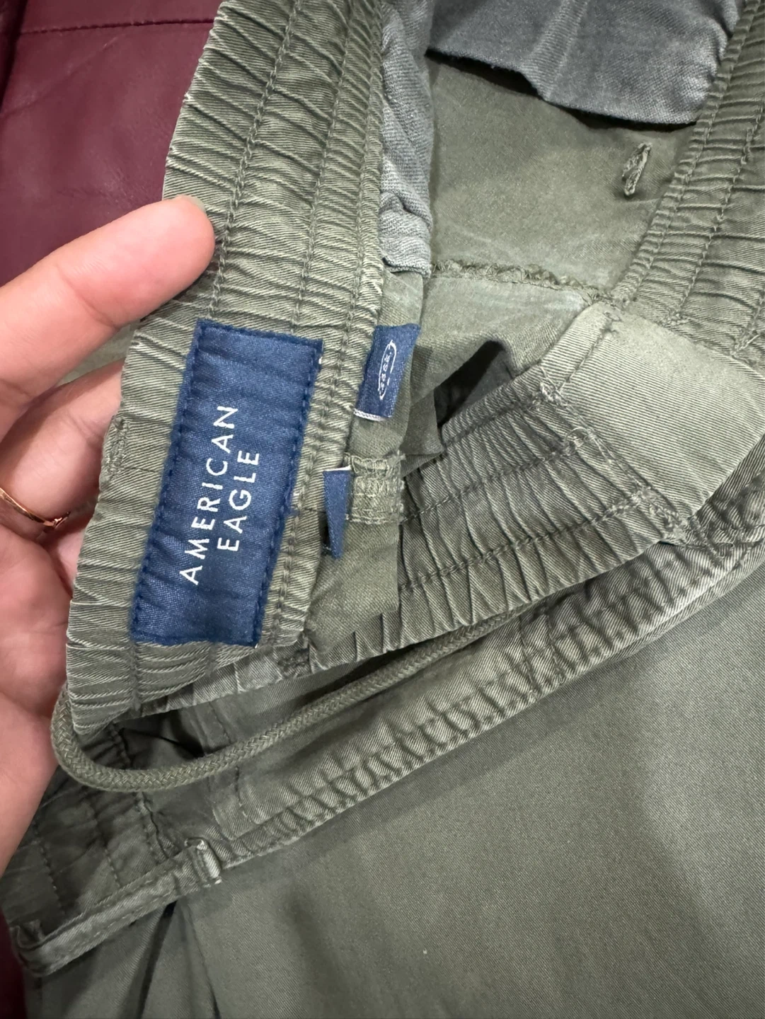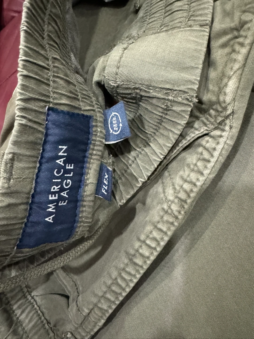 These are men's olive green cargo pants from American Eagle. They feature an elastic waistband with a drawstring and are made with flex fabric for comfort. Great for casual wear!