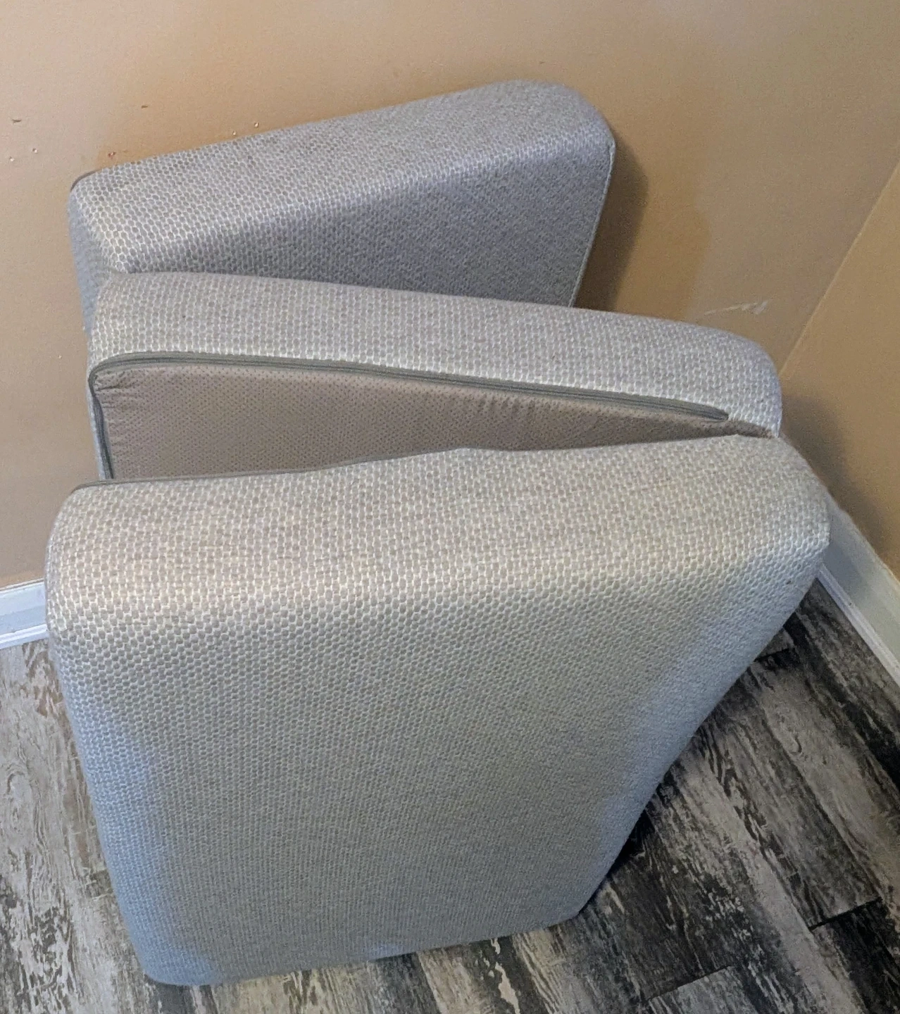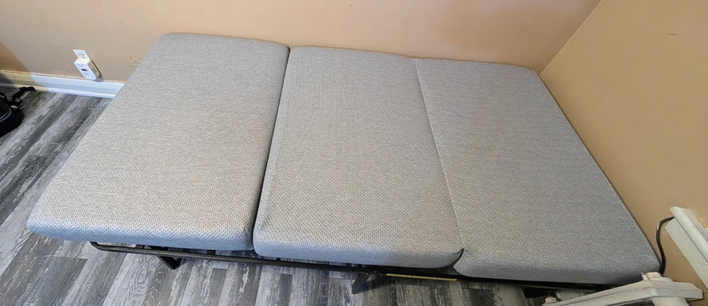 This is a twin size, 4-inch thick tri-folding mattress. It's made with foam and covered in a light grey fabric. This mattress folds up for easy storage and use as a sofa, chair or bed. It's in perfect condition. Only used for couple of months. Selling it due to moving.