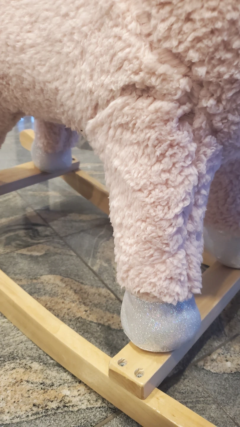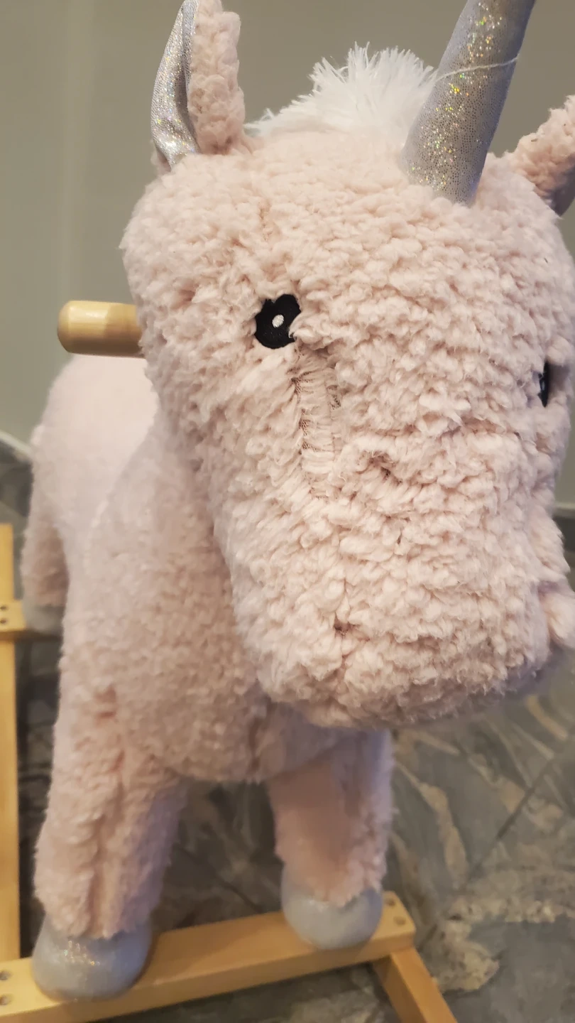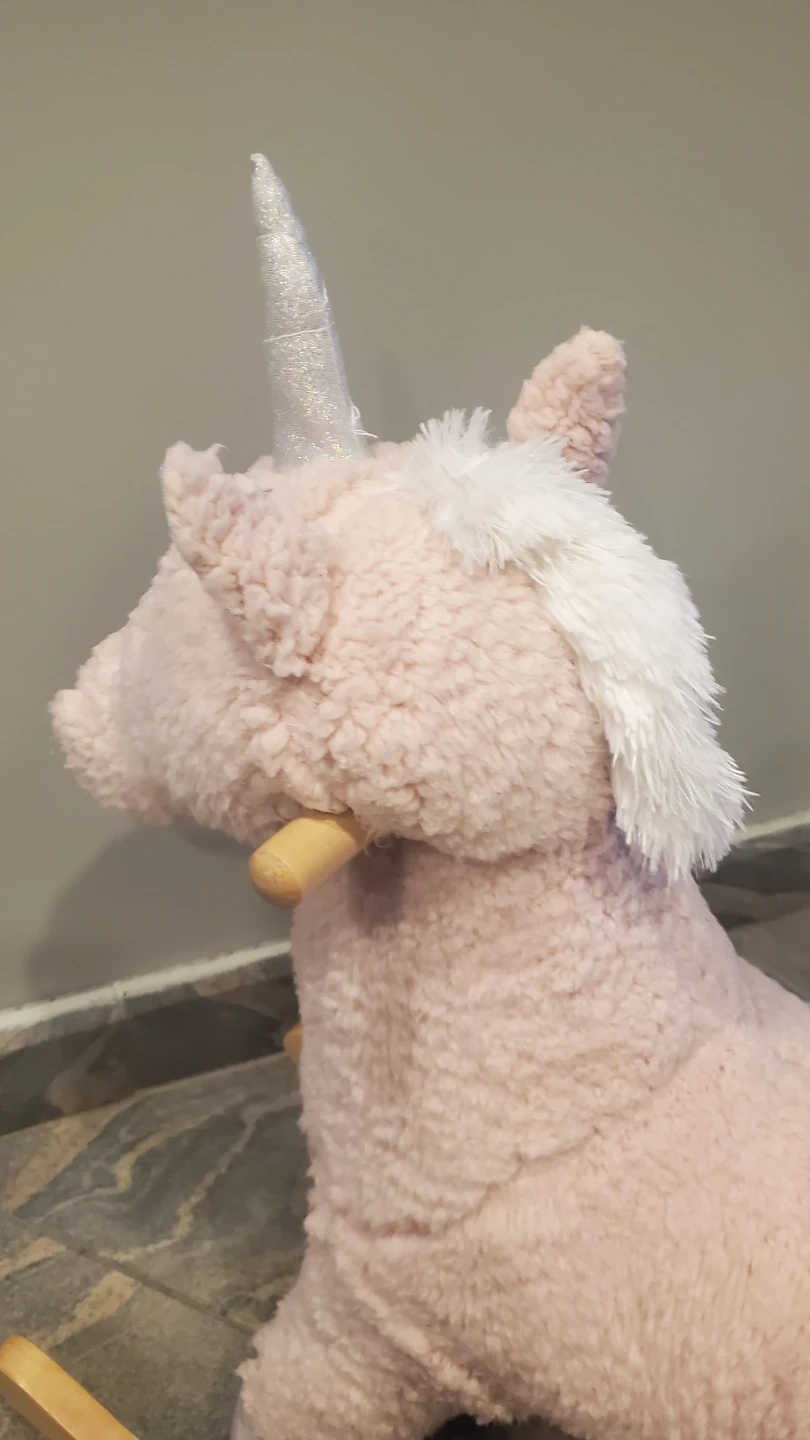 This adorable pink plush unicorn rocking horse features a sparkly horn and ears. It's built on a sturdy wooden rocking base. This toy is sure to be a favourite for imaginative play!