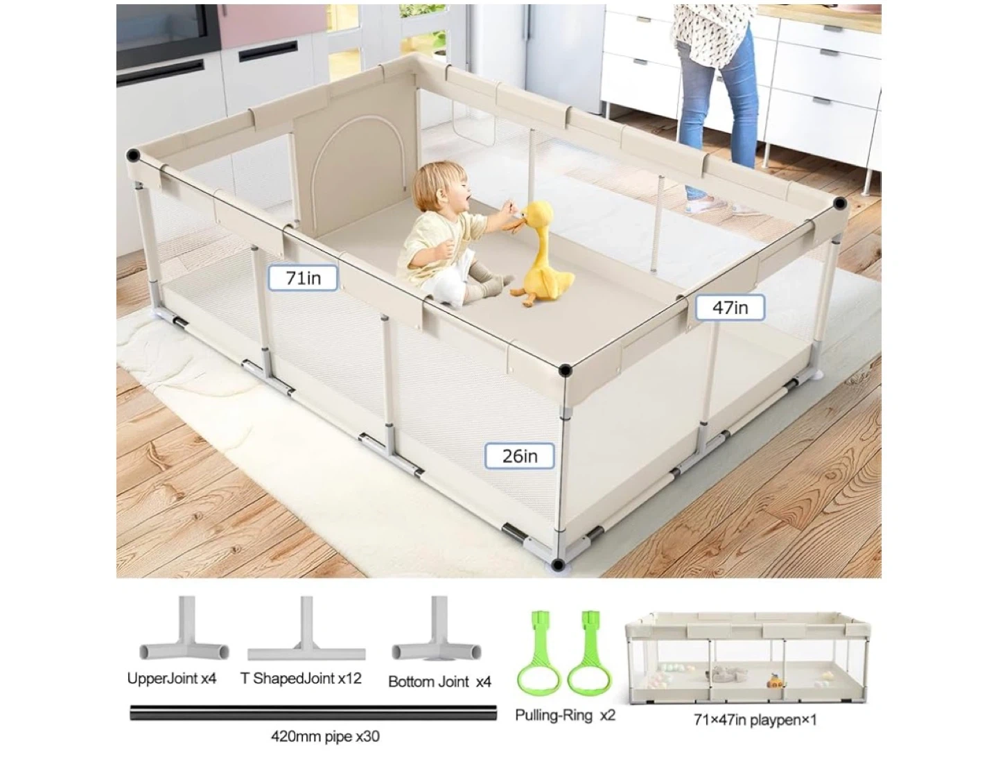 This baby playpen measures 71 inches long by 47 inches wide and stands 26 inches tall. It includes 30 pieces of 420mm pipes, 12 T-shaped joints, 4 upper joints, 4 bottom joints. The playpen is made from durable materials for safety. It's great for keeping little ones entertained and safe in their own space. Assembled dimensions: 71in x 47in x 26in.