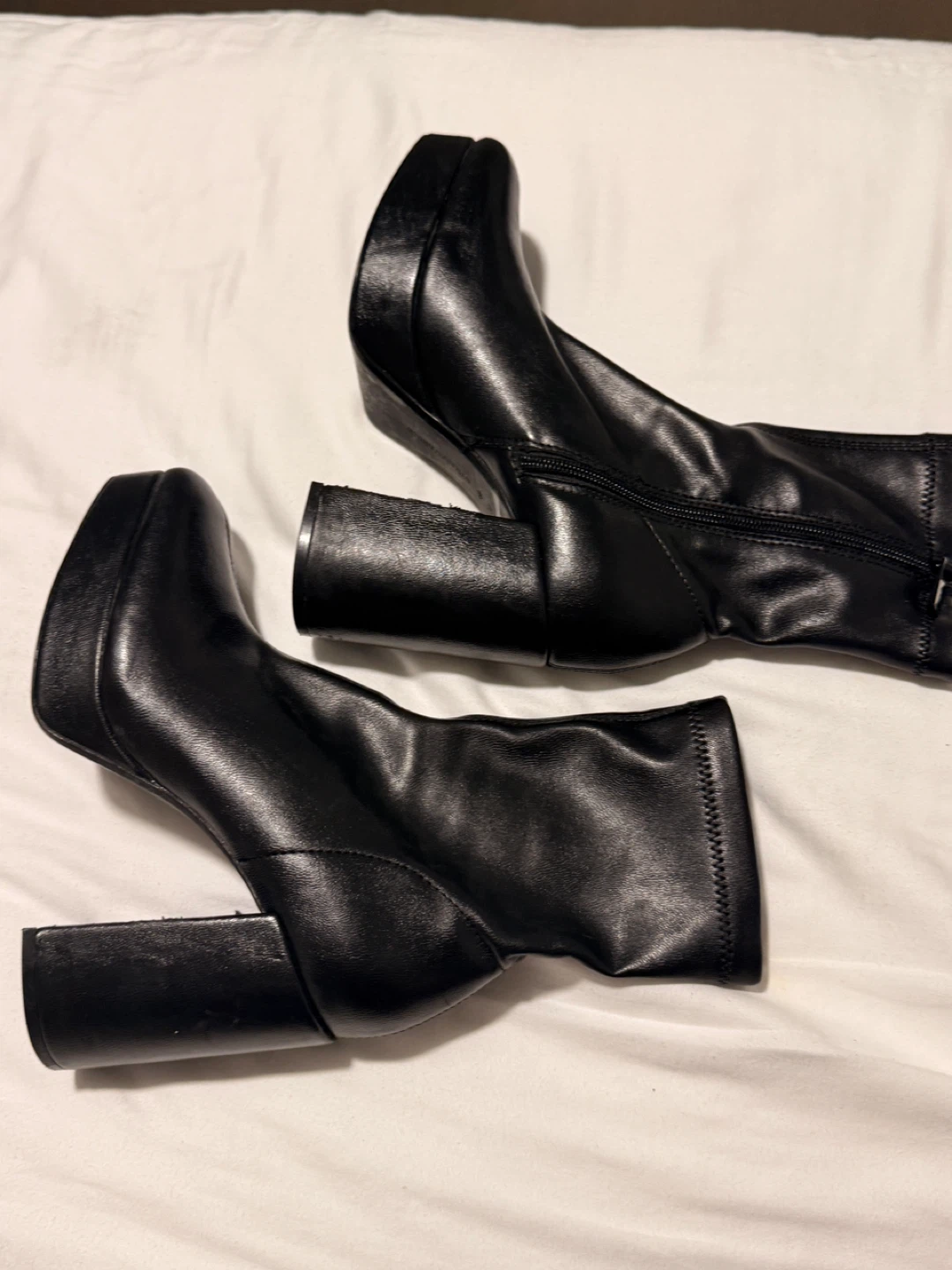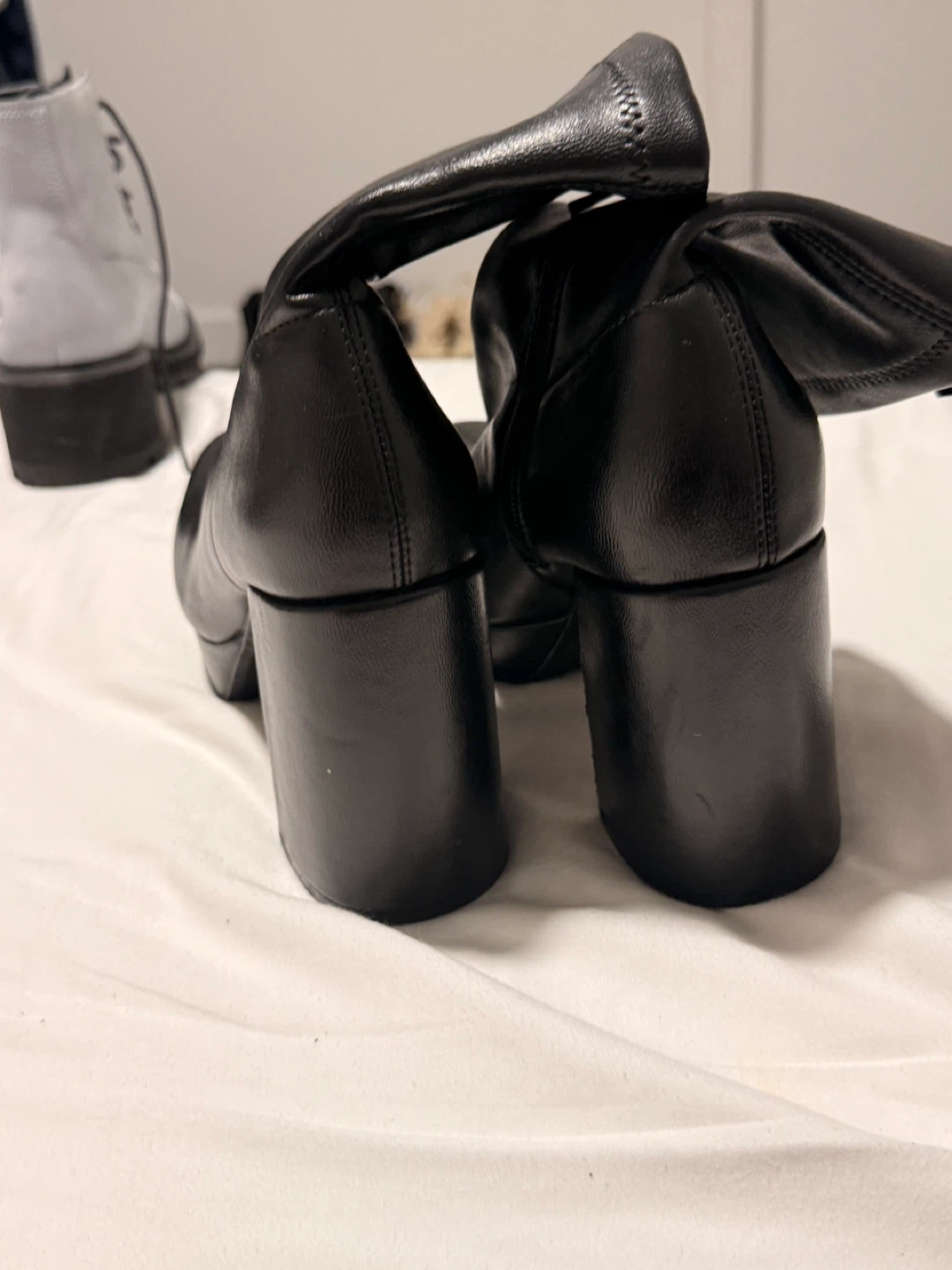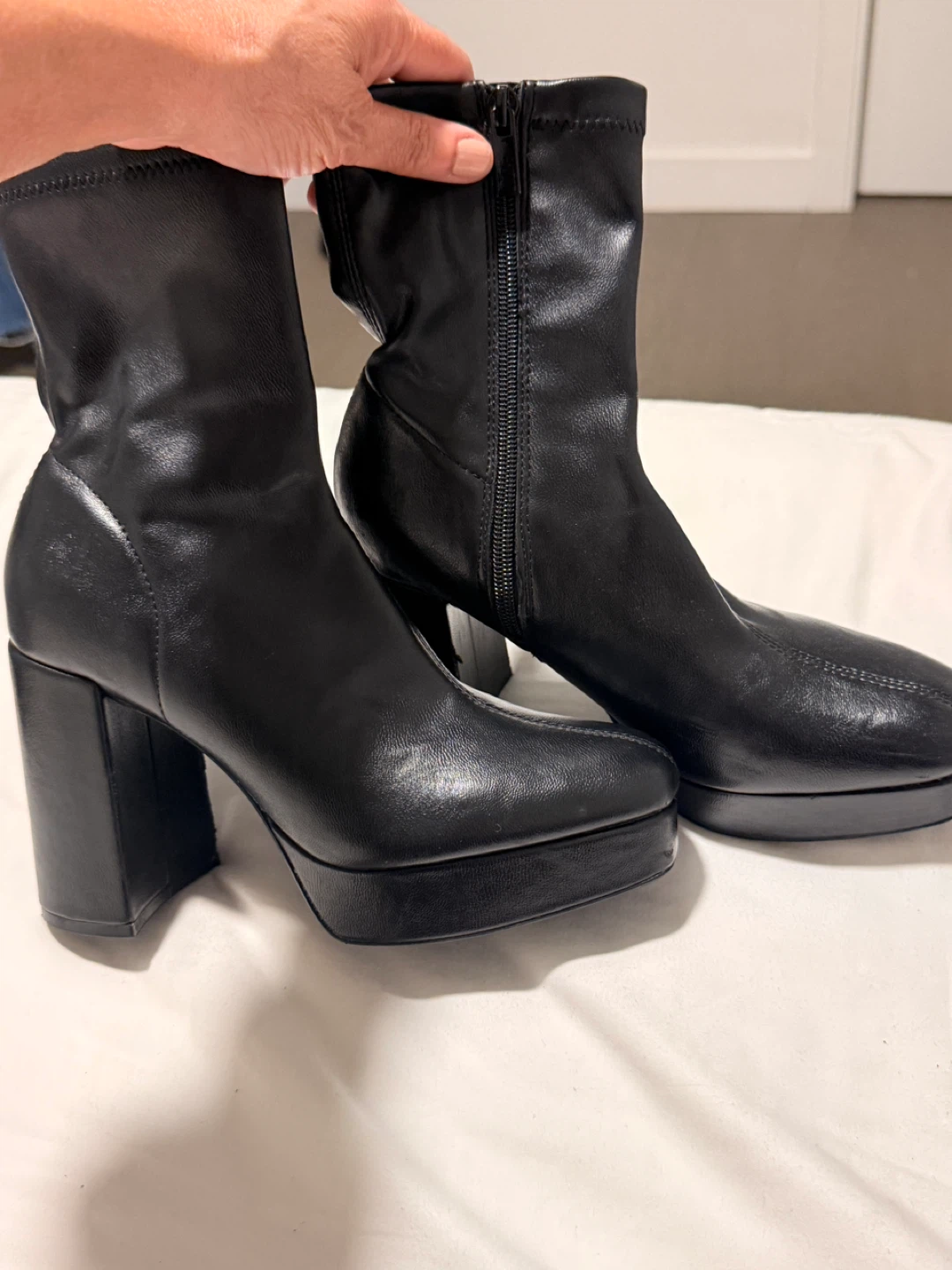 Selling a pair of black platform boots. They are a size 7. These boots feature a chunky heel and a sleek design, perfect for adding a bit of edge to any outfit!