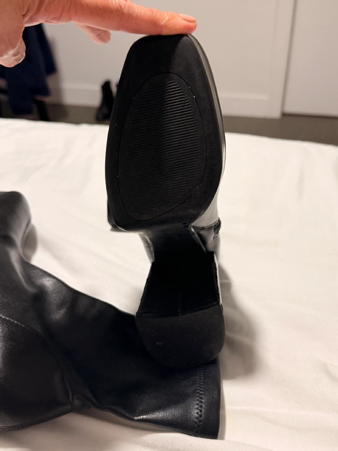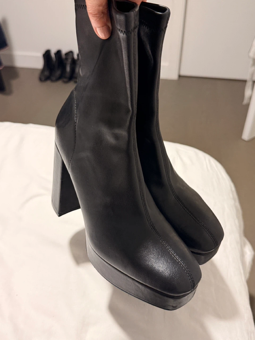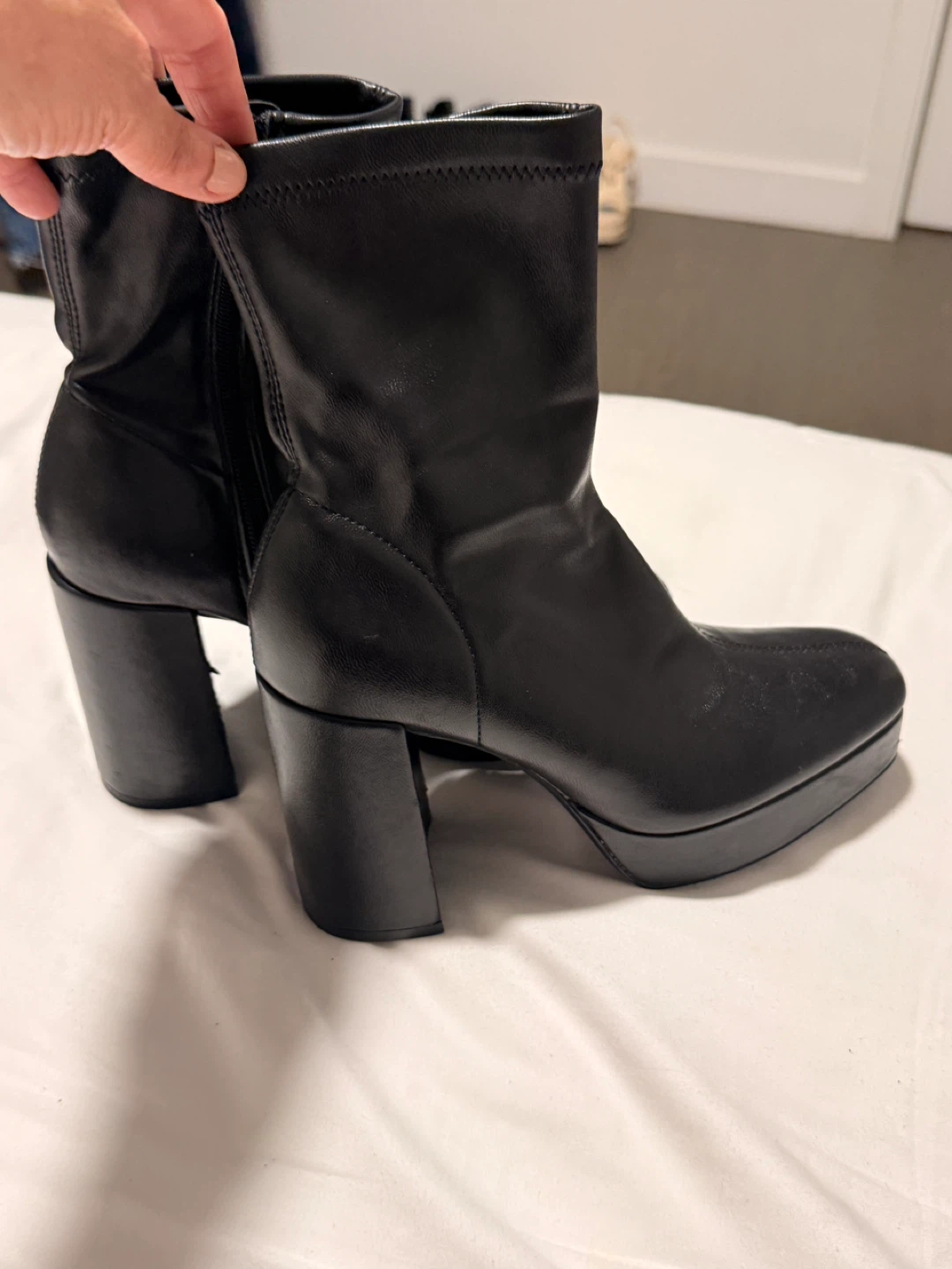 Selling a pair of black platform boots. They are a size 7. These boots feature a chunky heel and a sleek design, perfect for adding a bit of edge to any outfit!