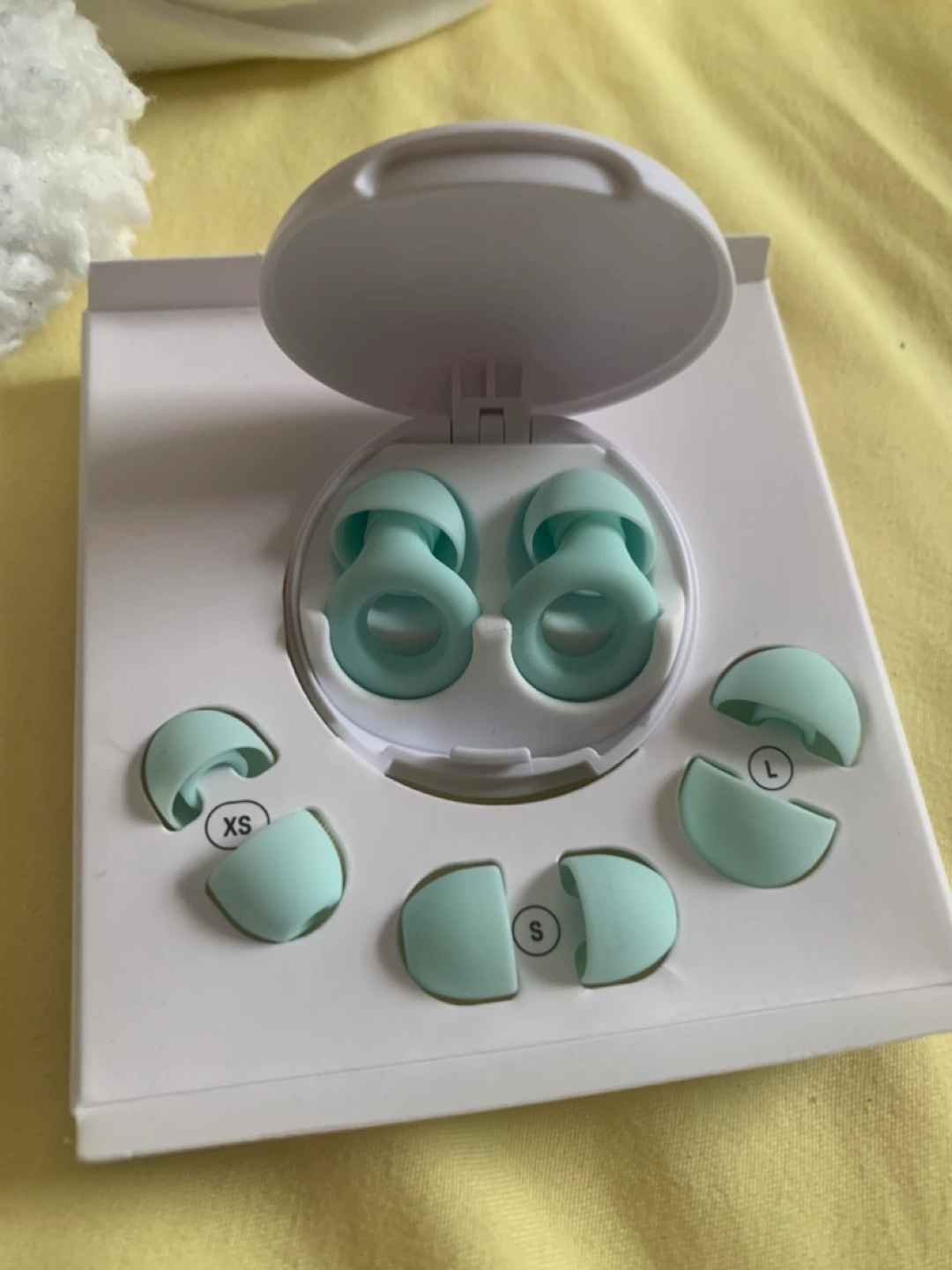 New, unused earplugs. Mint green colour. Includes multiple sizes of ear tips. Compact carrying case.