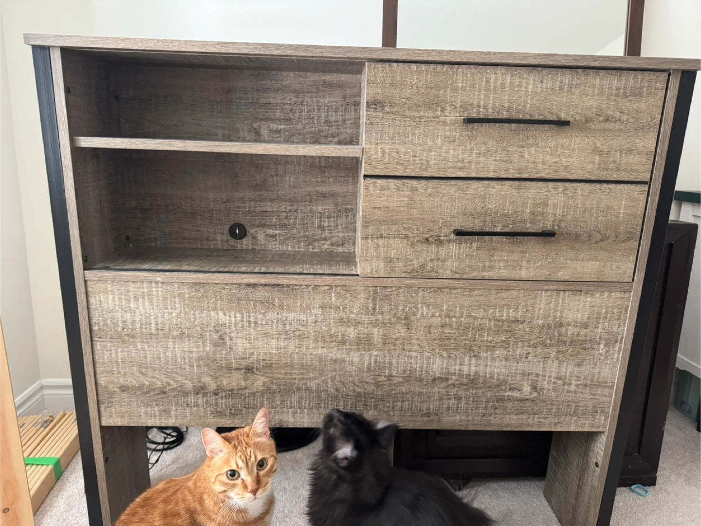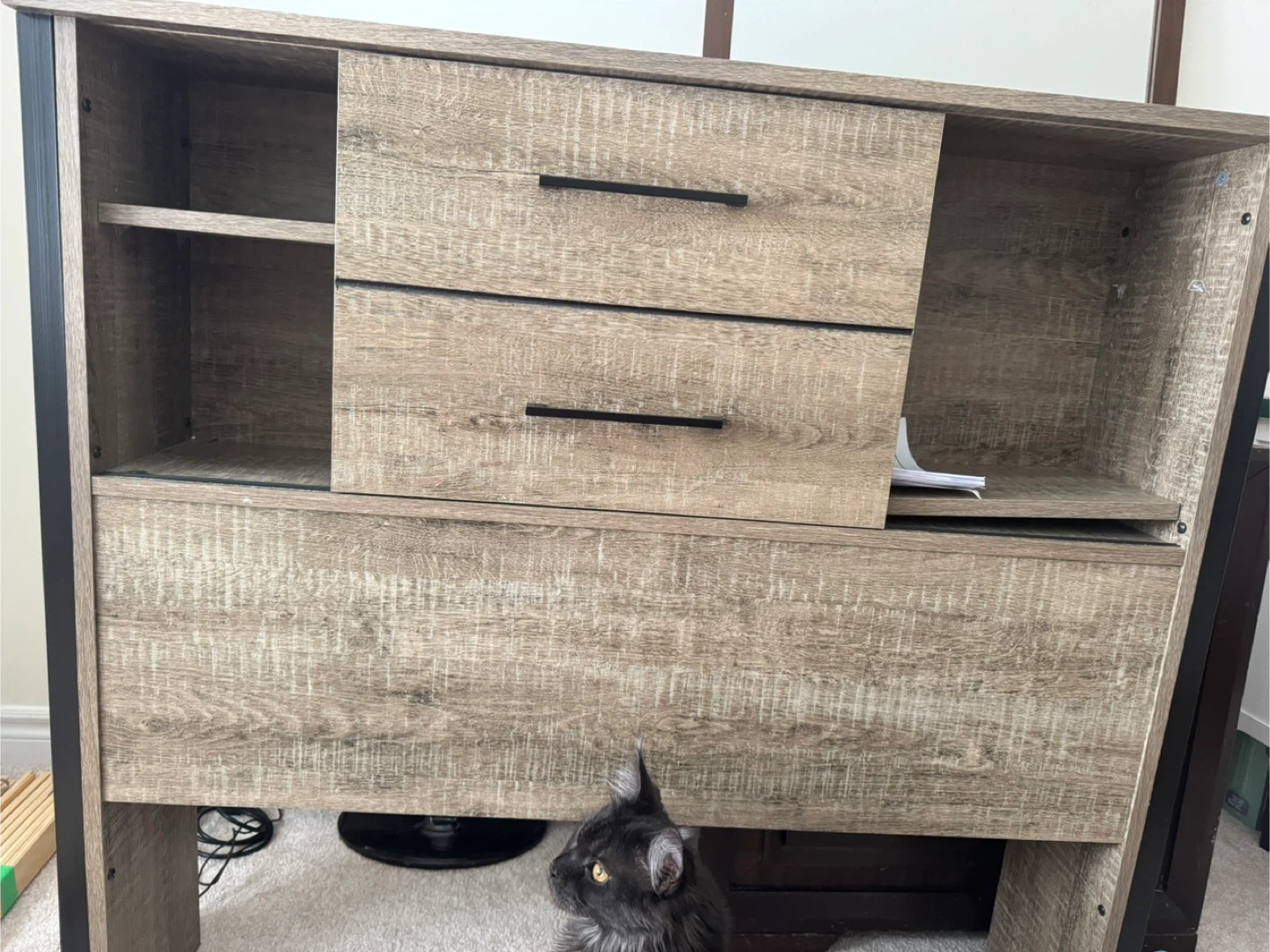 This twin bed headboard a rustic wood finish with black metal accents. It includes two spacious sliding and open shelving. Already Assembled & light weight!