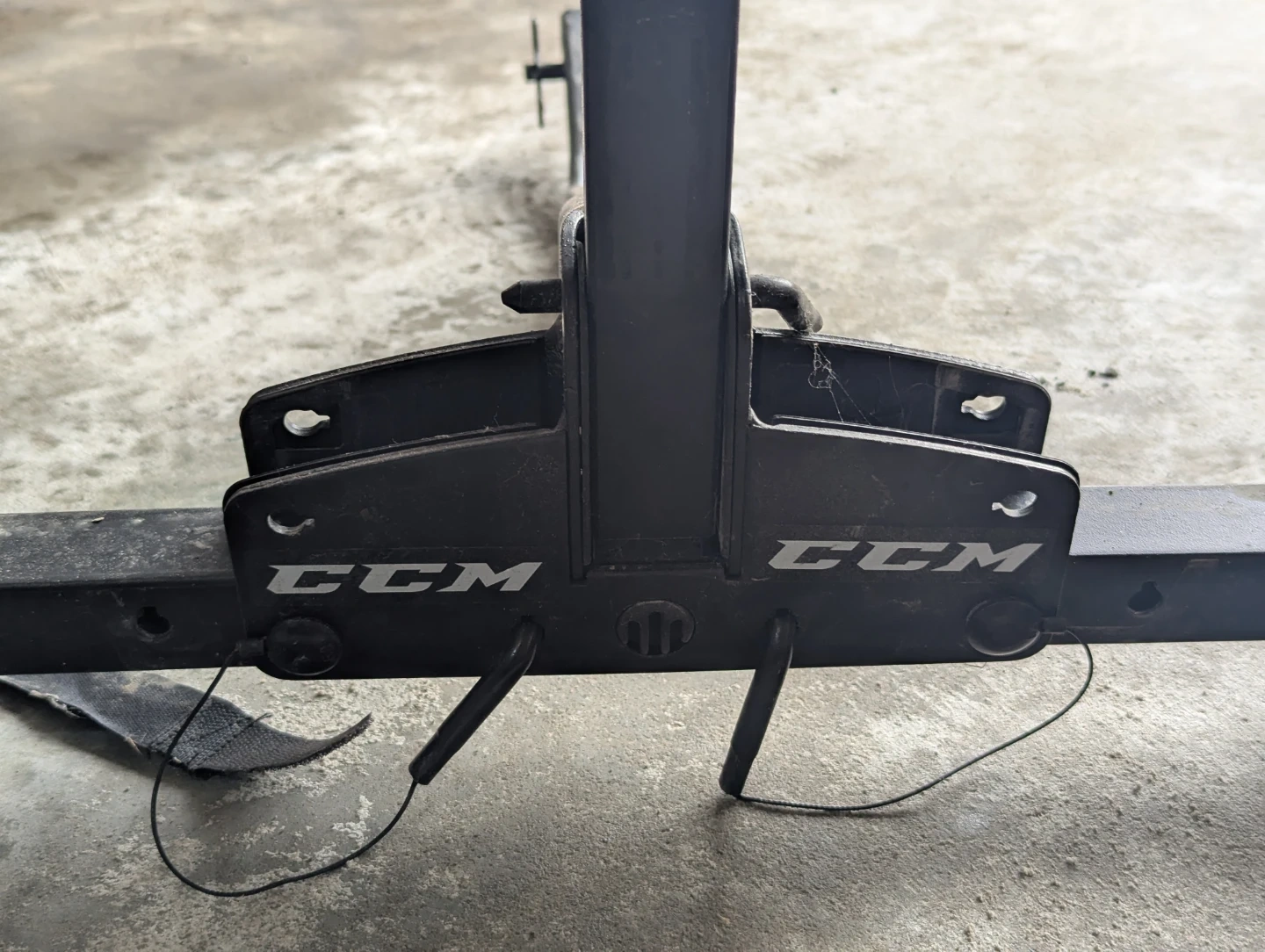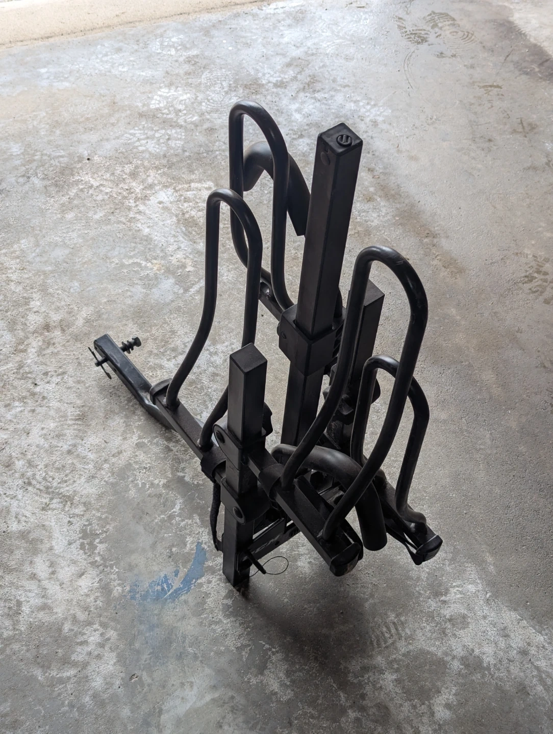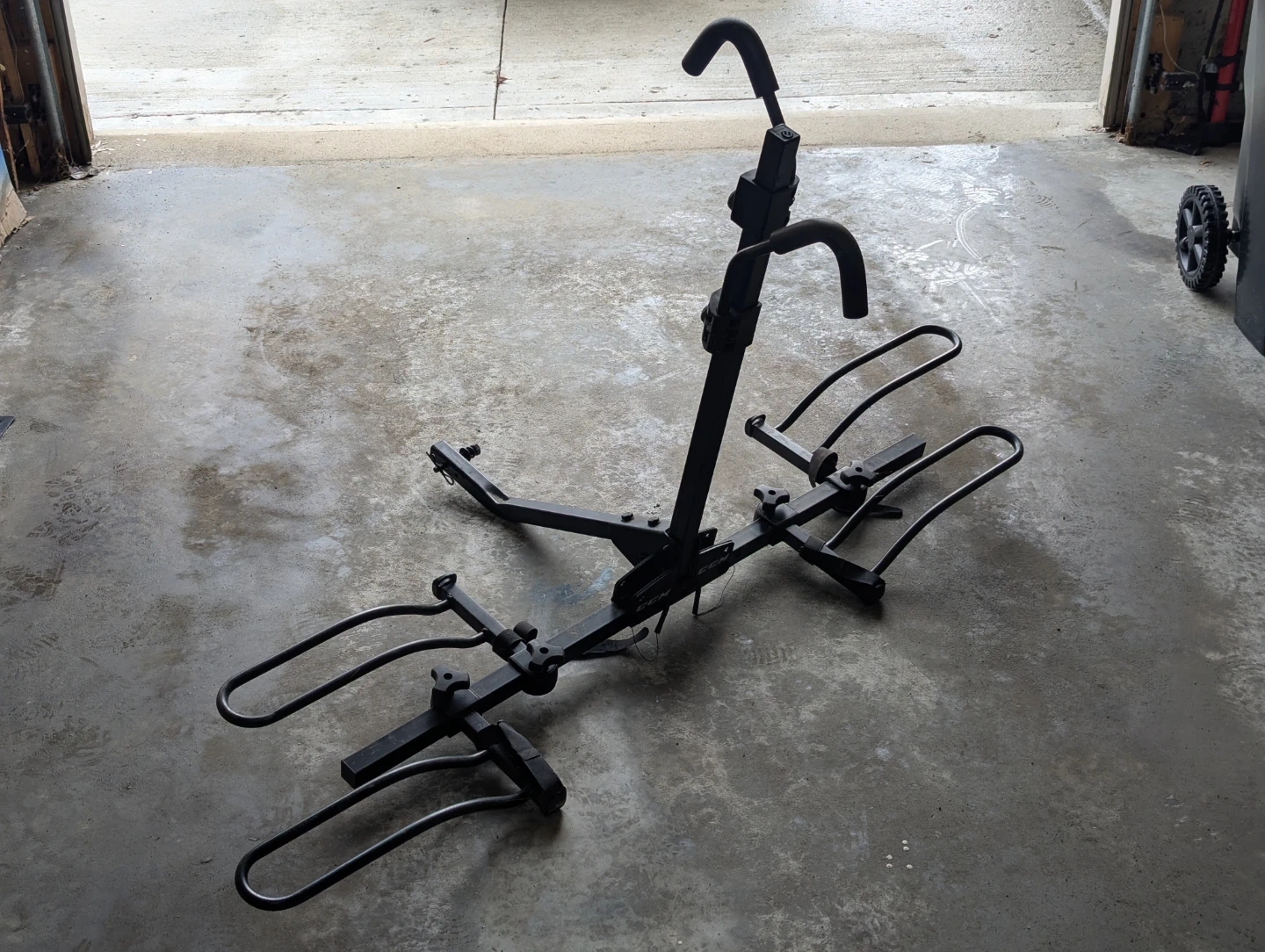 A black CCM hitch-mounted bike rack. It's designed to hold up to two bikes for transport. Rack is made of durable metal construction.