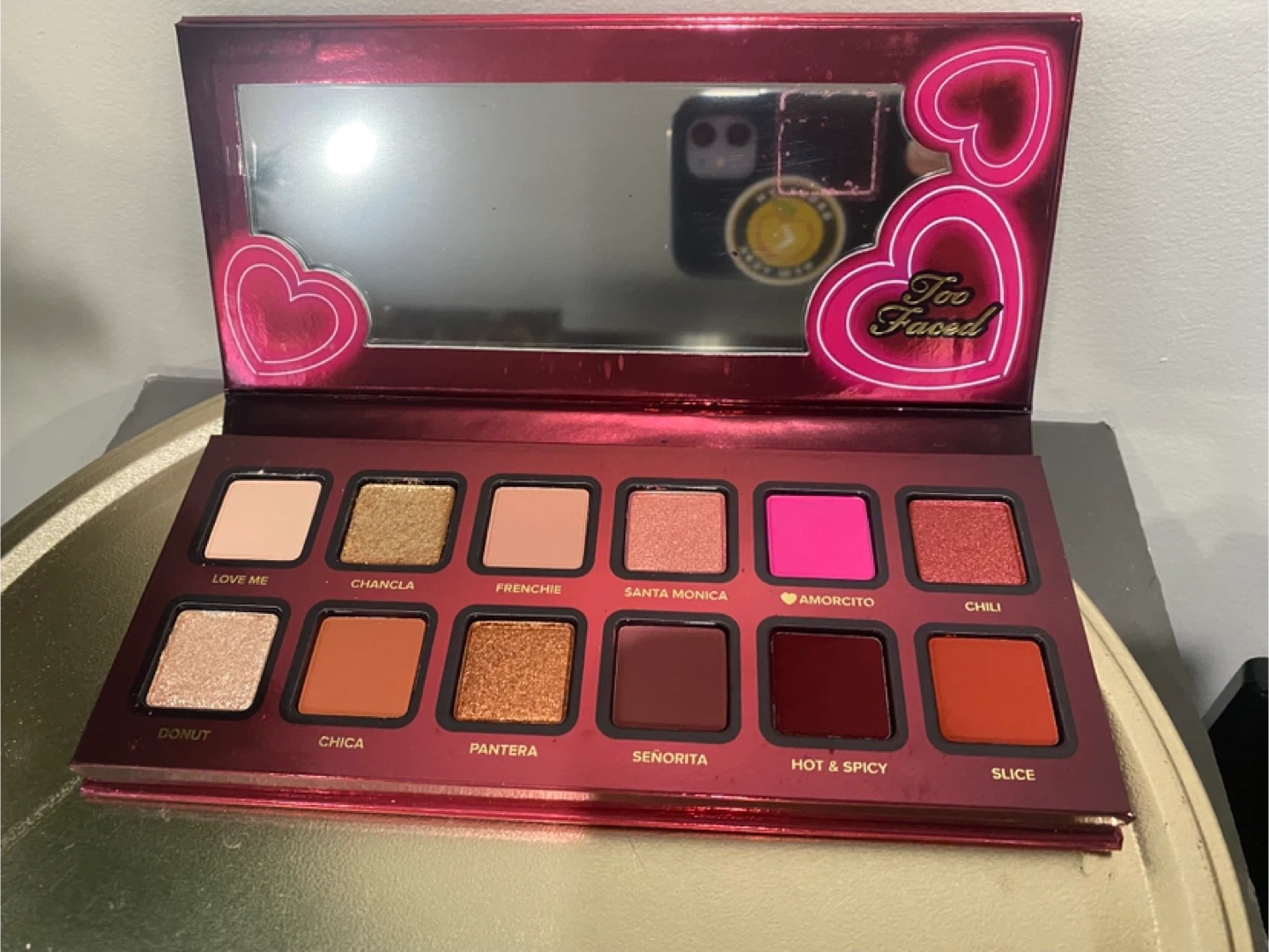 Never used Too Faced Mariale Amor Caliente Eyeshadow & Cheek Pressed Pigment Palette. It includes 11 eyeshadows and 1 pressed pigment designed for cheeks.