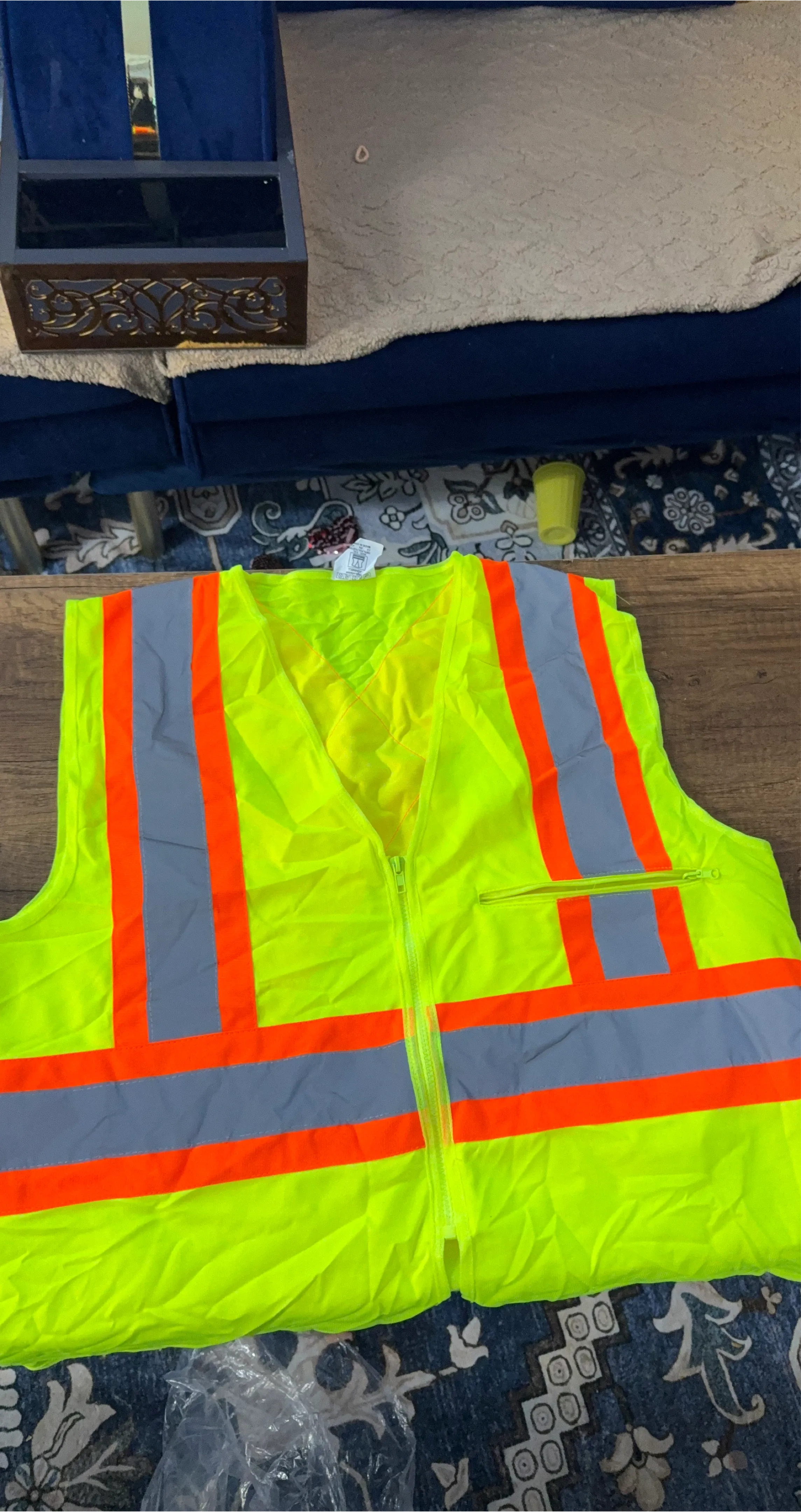 This high-visibility safety vest is bright neon yellow with orange and grey reflective strips. It has a zip-front closure and a chest pocket with a zipper. This vest provides enhanced visibility for outdoor work or activities.