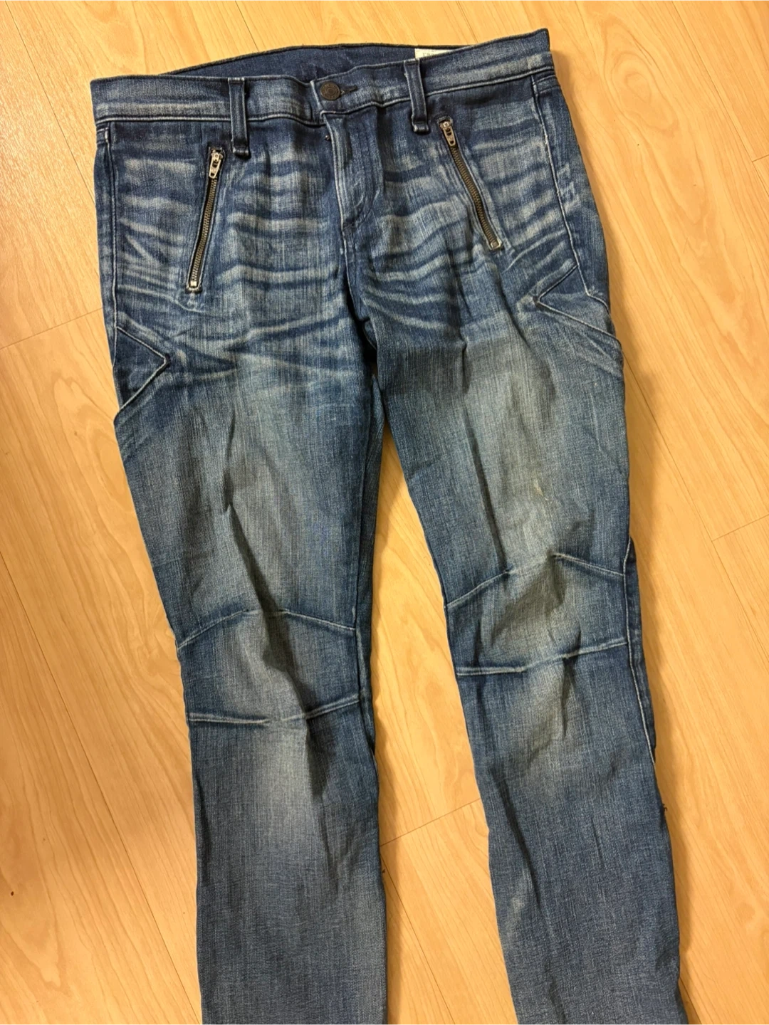 These Rag & Bone jeans have a distressed blue wash and moto-inspired detailing. They feature zippered pockets on the front and a classic five-pocket design. Denim construction.