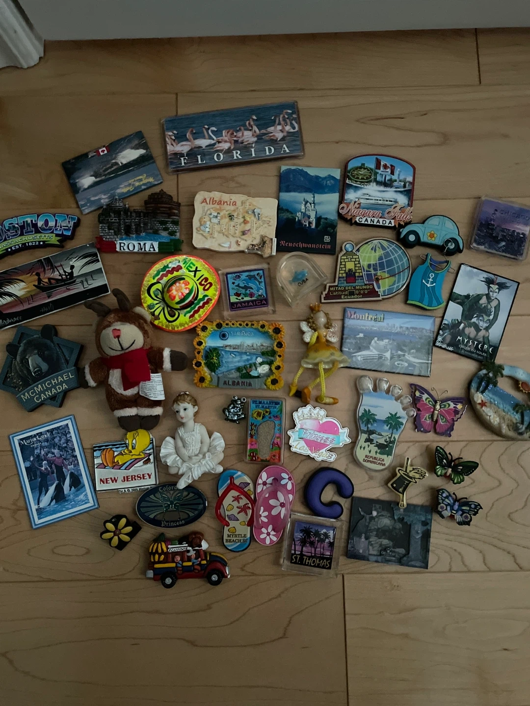 Selling a collection of fridge magnets from various locations around the world, including Florida, Albania, Mexico, Jamaica, Niagara Falls, Montreal, and St. Thomas. A fun way to remember your travels!