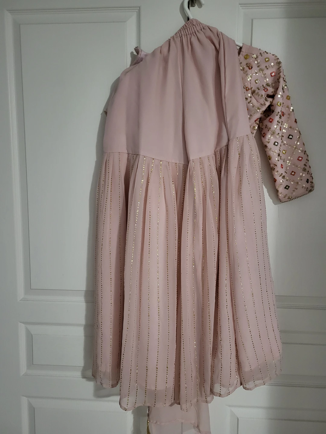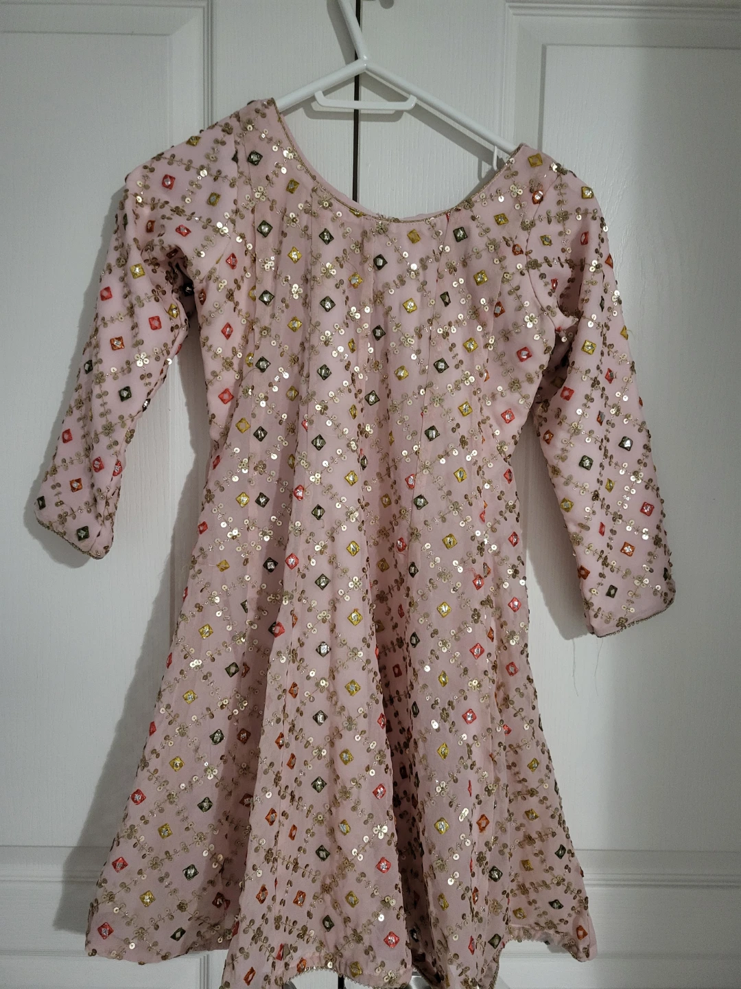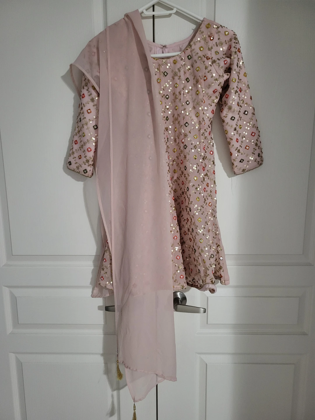 Selling a beautiful pink Salwar Kameez suit. The fabric is soft and flowy, perfect for a special occasion. It features a lovely pattern with square accents.