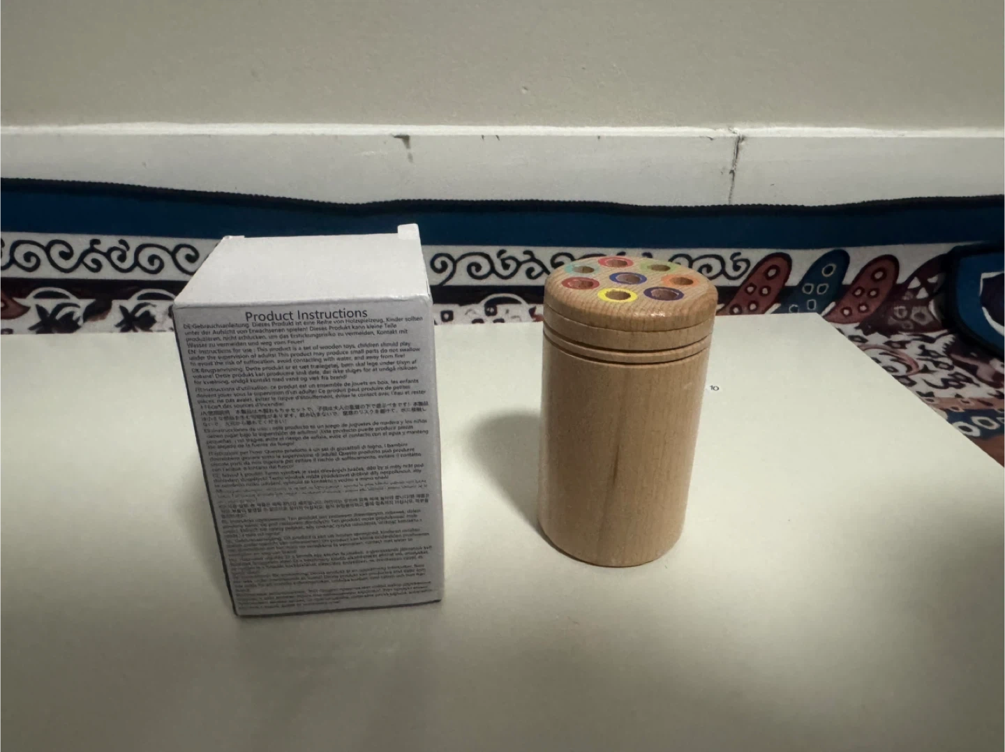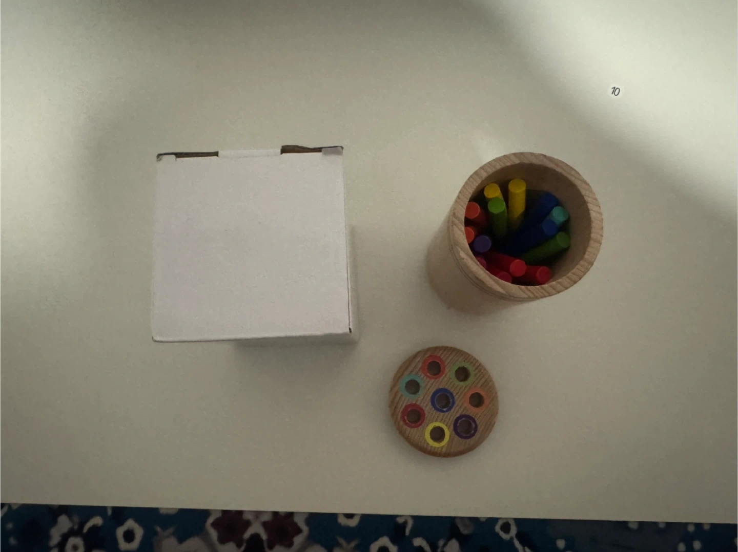 This is a wooden peg puzzle toy with colourful pegs. It comes in its original box. Great for little ones learning to sort colours and develop fine motor skills!