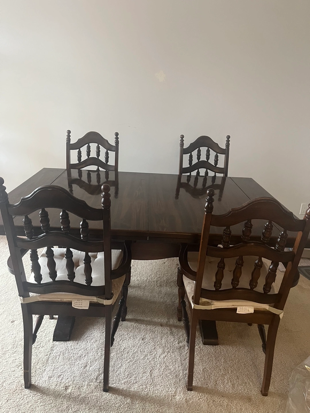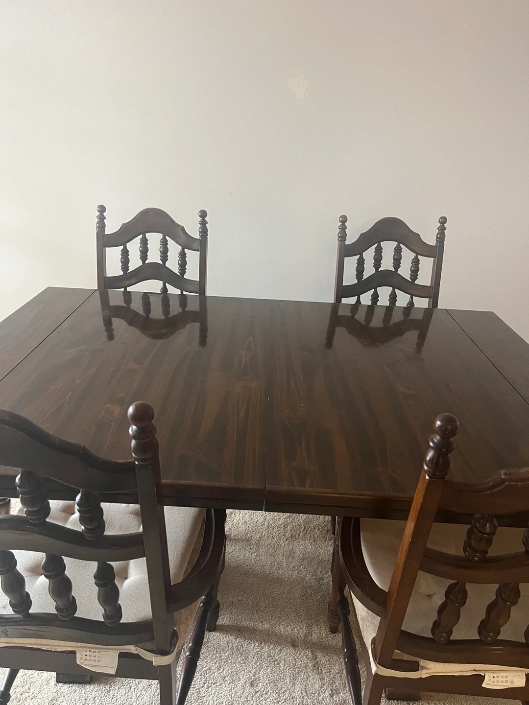 Dark brown wooden dining table. Four matching chairs included free . Table is solid and very good condition