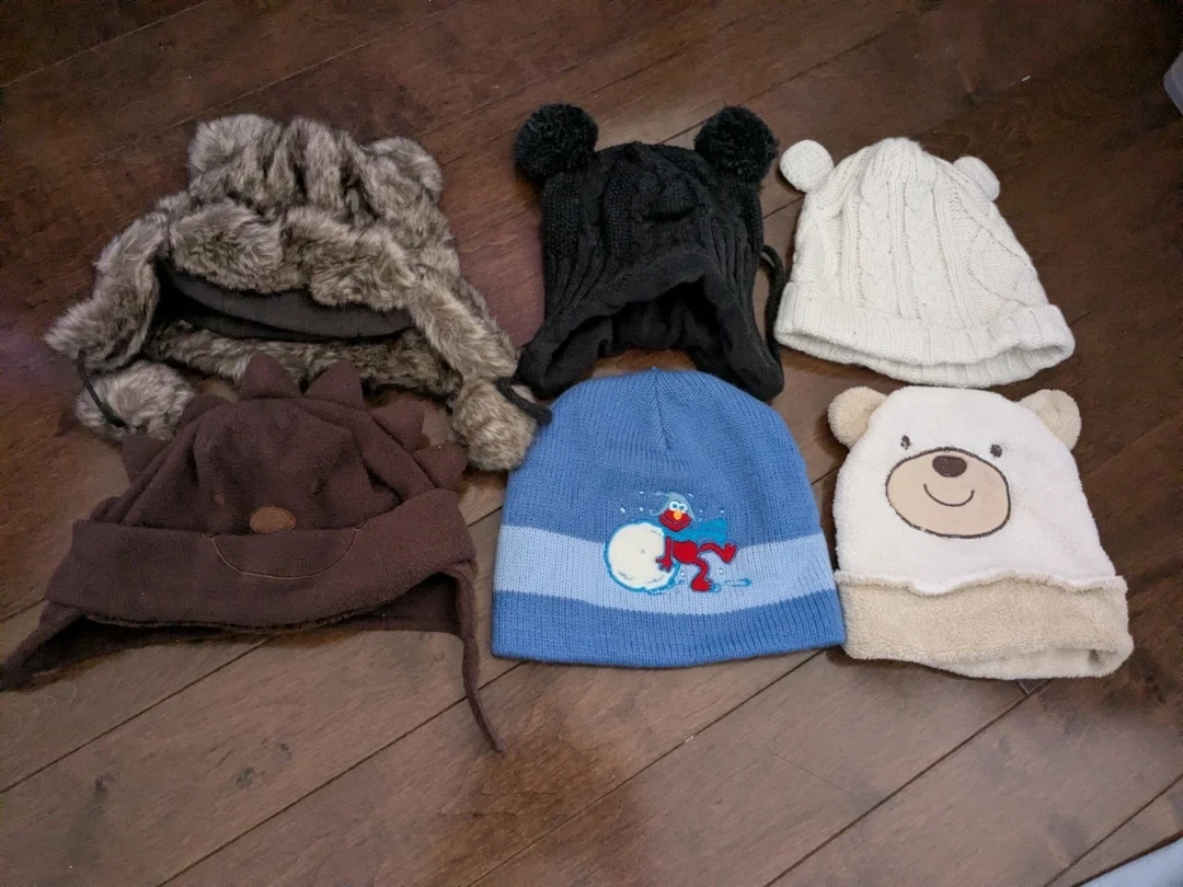 A collection of baby hats for ages 0-6 months! There's a variety of styles and colours to keep your little one cozy and stylish. Perfect for keeping their heads warm during those chilly Canadian months.