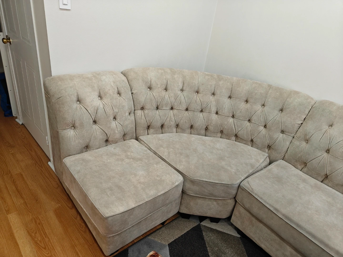 Selling a sectional sofa in a neutral beige colour! It's in great shape and would be perfect for a living room or den. The dimensions are 121 inches by 66 inches, with a seat depth of 36 inches. It features a stylish tufted design.