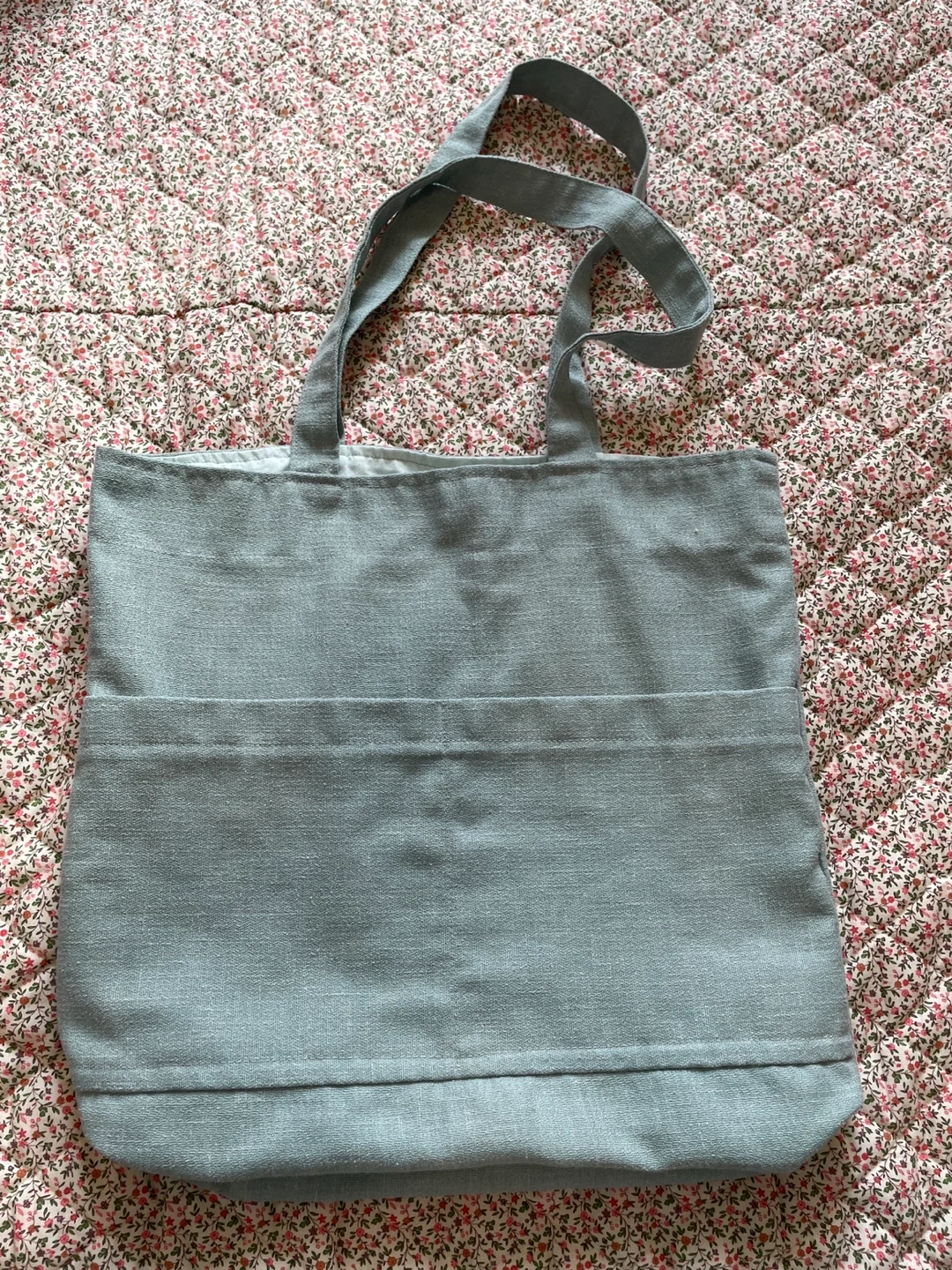 Light blue canvas tote bag with two front pockets and a snap closure. It has an interior lining and two comfortable shoulder straps. This bag is great for everyday use!