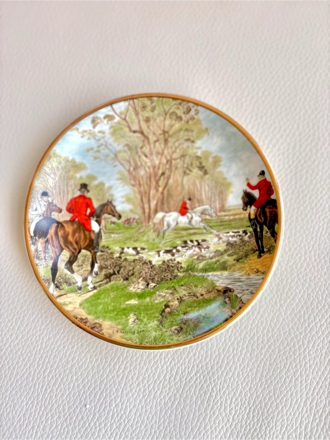 A decorative plate featuring a classic fox hunting scene with riders and hounds. The plate has a gold trim. It's a lovely piece for display.