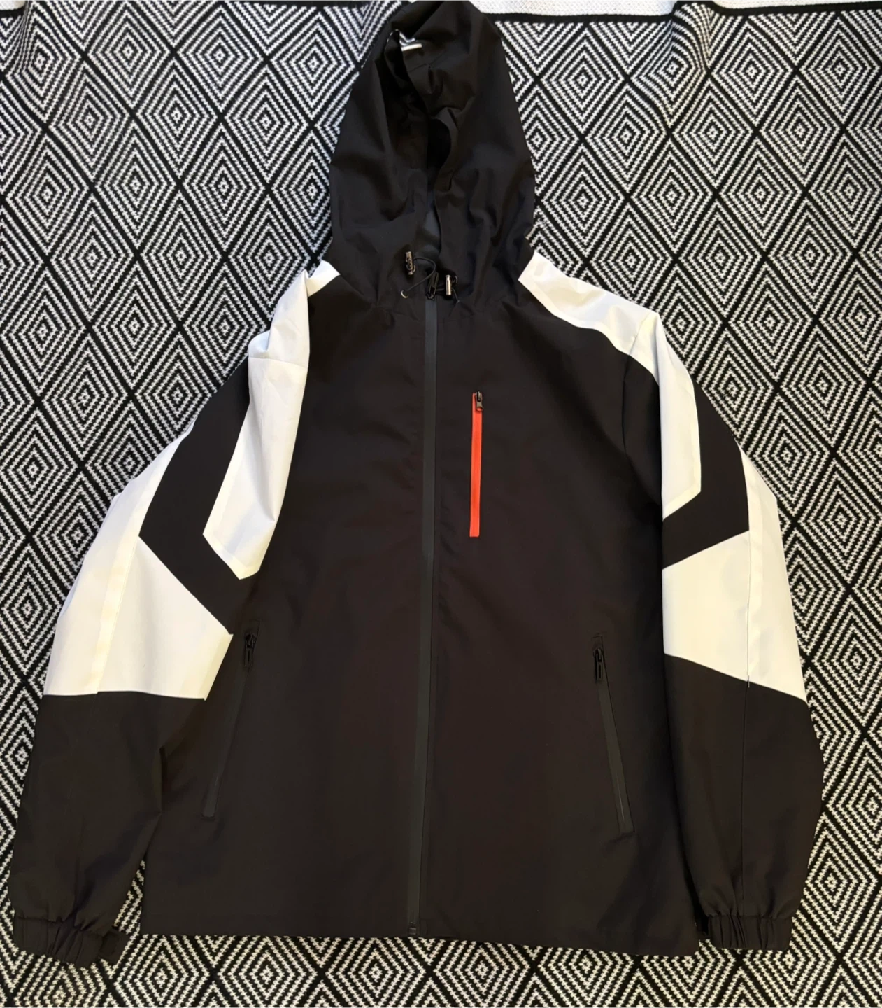 Hooded jacket with a black body and white panel details on the sleeves. It features a full zipper closure and zippered pockets. The hood is adjustable with a drawstring. It's a stylish and practical outer layer.