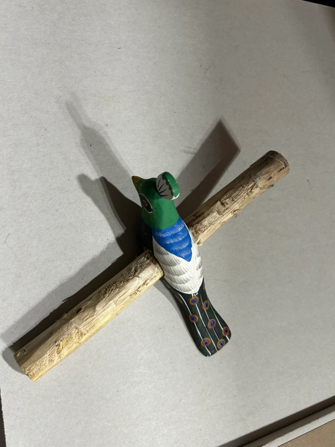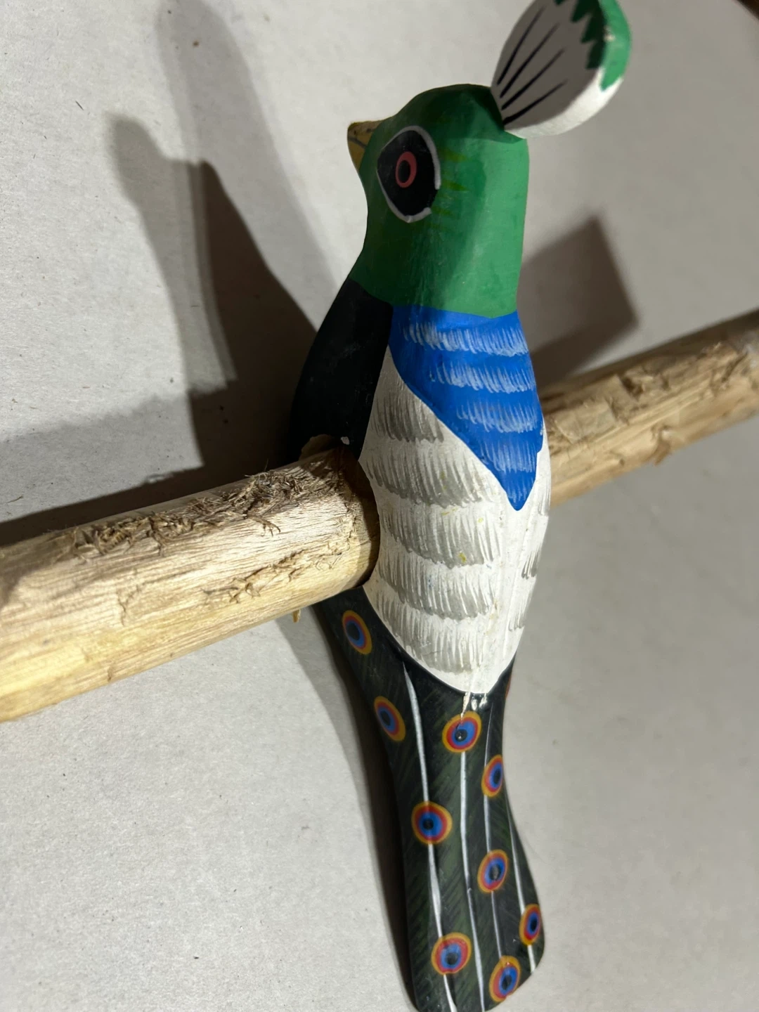 A colourful wooden bird figurine, made in the Philippines. It's mounted on a natural wood perch. This piece would add a unique touch to home decor.