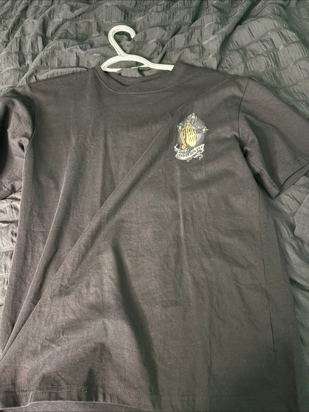 Selling a Chrome Hearts black t-shirt. The shirt features a unique design on the front and back. It's in great condition and ready for a new home