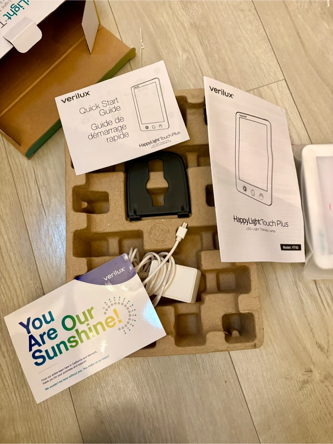 This is a Verilux HappyLight Touch Plus LED Light Therapy Lamp. It comes with the lamp, a power cord, and instruction manuals.