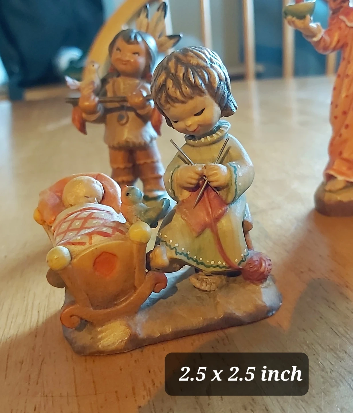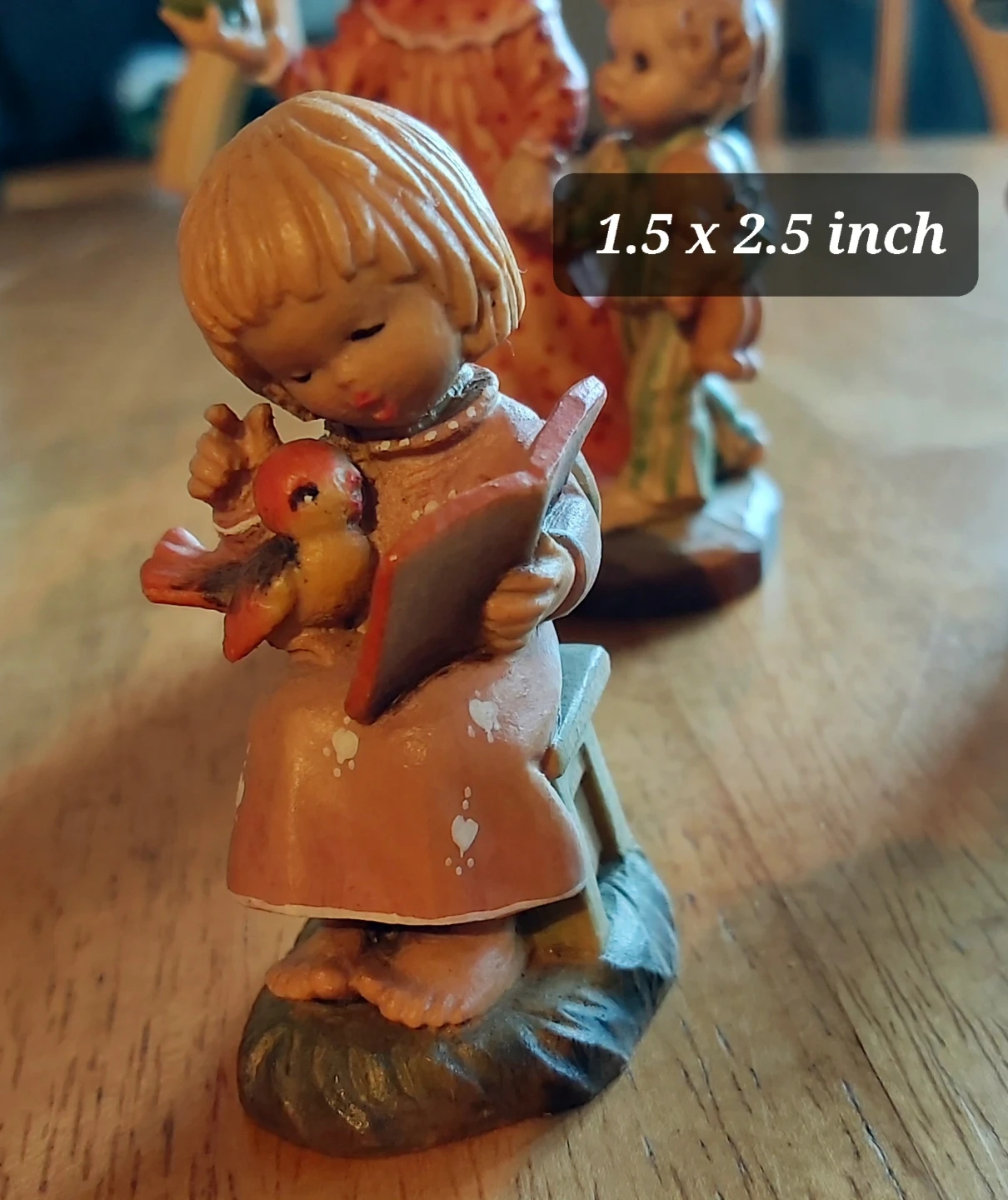 Collection of charming figurines designed by Valentine. Pieces include an indigenous child with a bird, a pair of children with a candle and teddy bear, and a boy with a hat and satchel. This set is made in Italy.