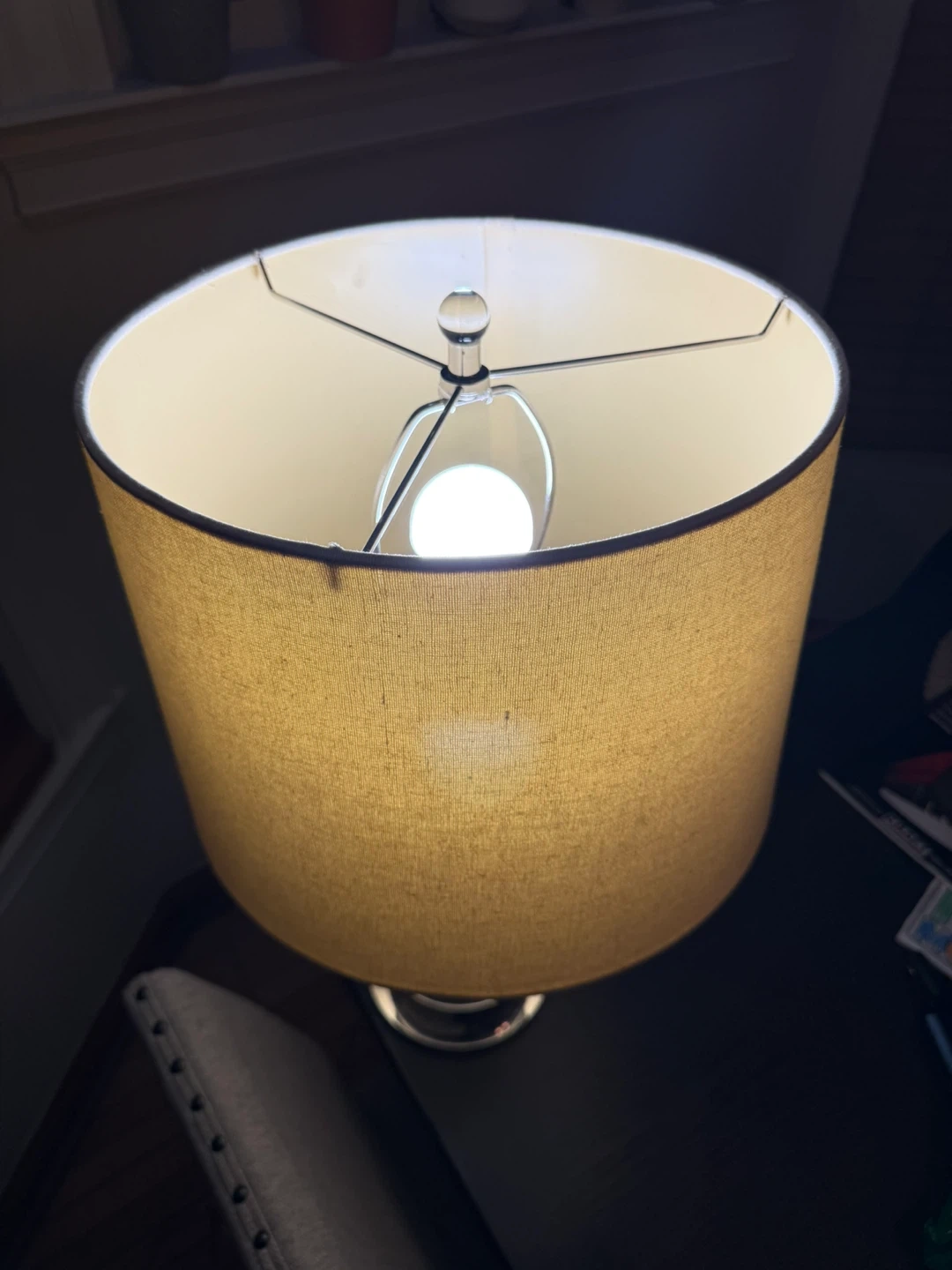 Beautiful modern mercury glass table lamp with stacked glass sphere base and warm drum shade. Works perfectly and gives off a soft cozy light.