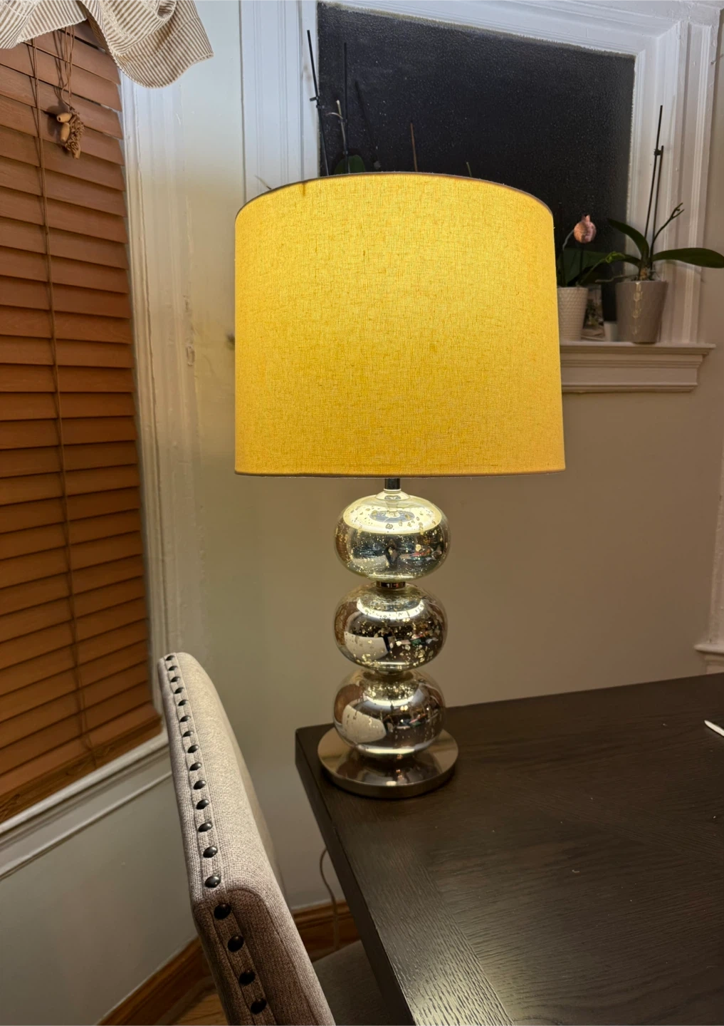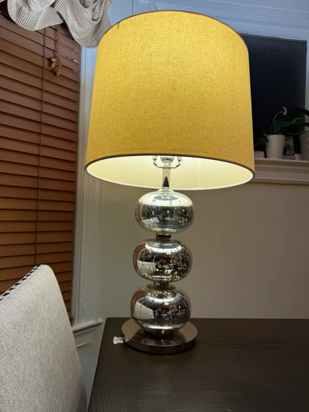 Beautiful modern mercury glass table lamp with stacked glass sphere base and warm drum shade. Works perfectly and gives off a soft cozy light.