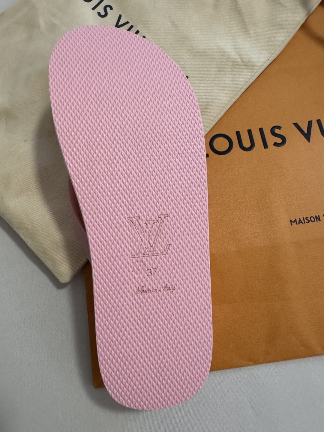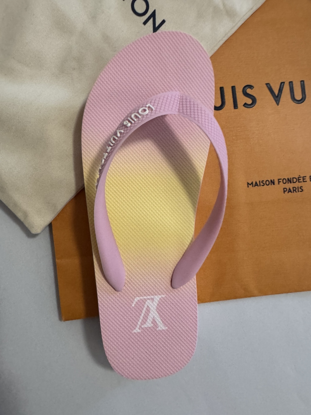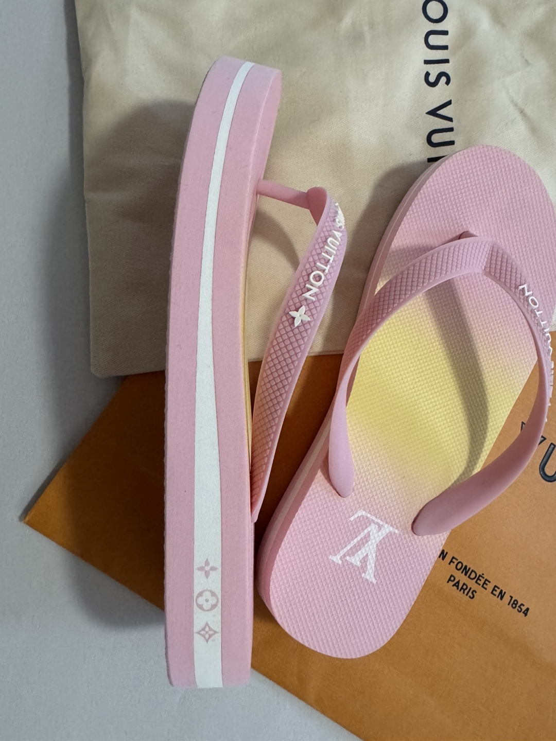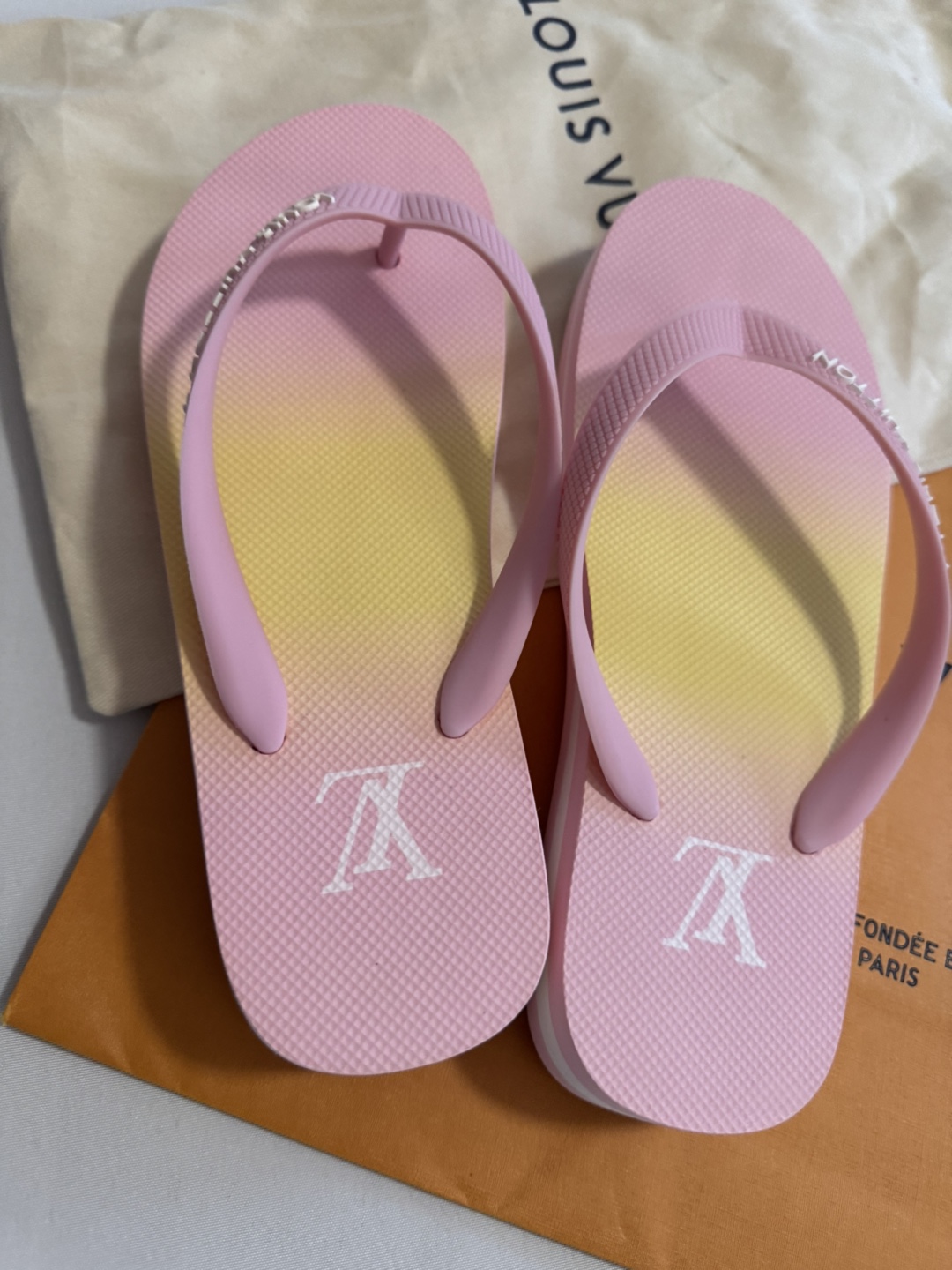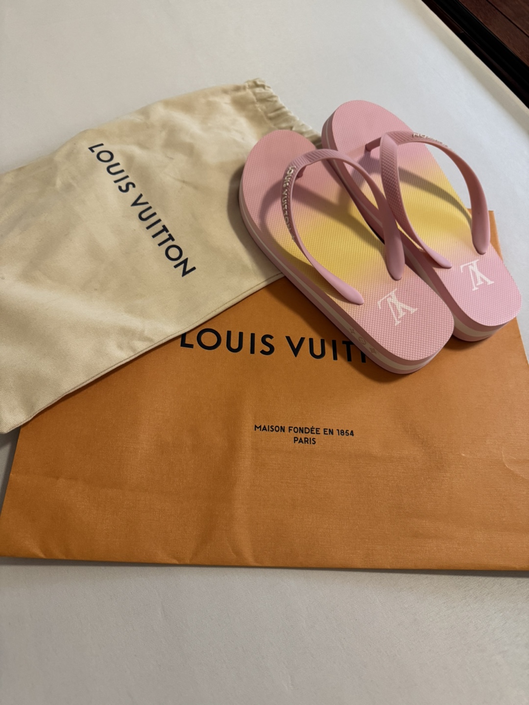 Selling a pair of Louis Vuitton Sunset flip flops in a beautiful pink ombre color. They are a size 37. Comes with the original box and dust bag!
