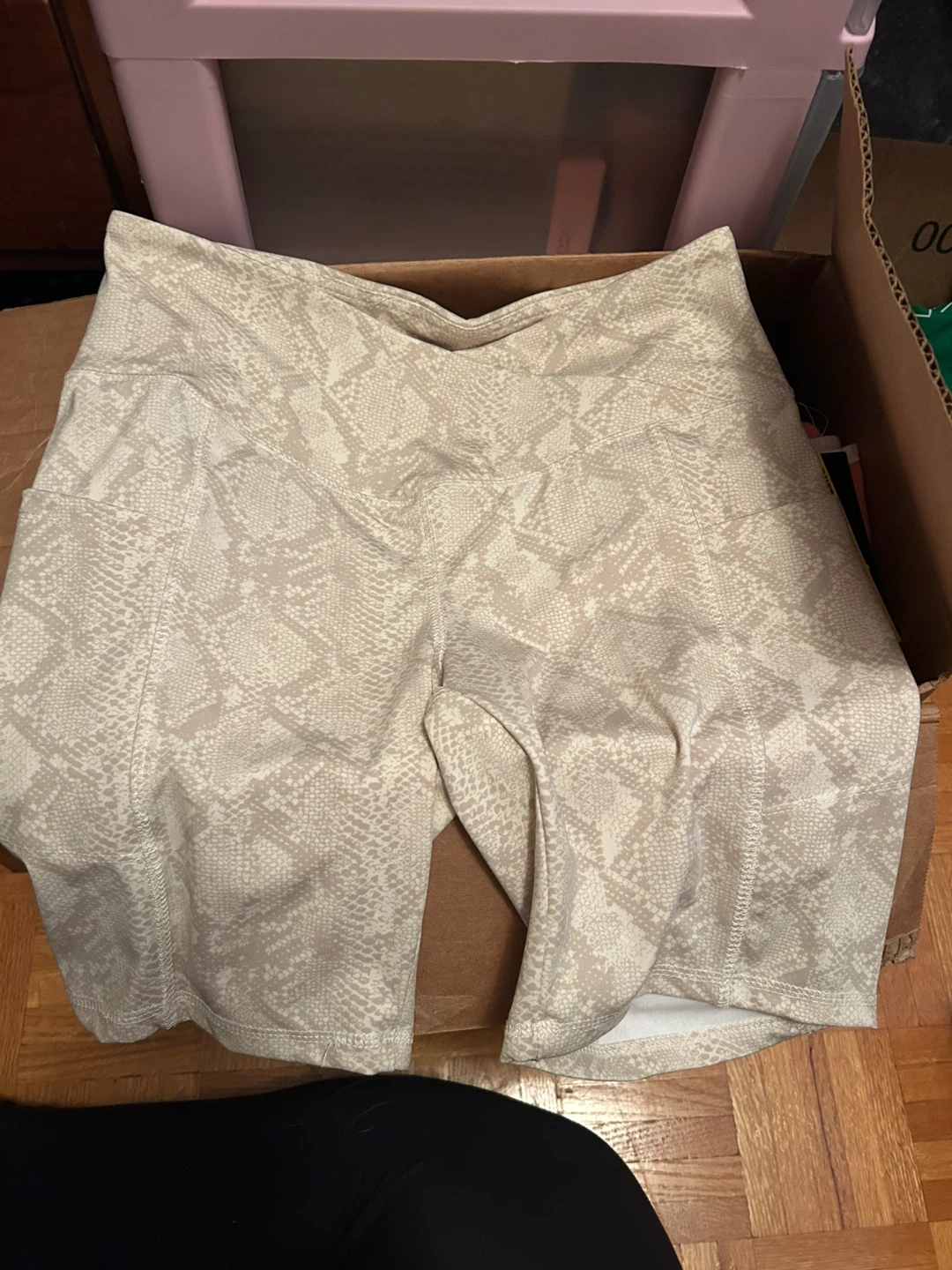 These are Sommer Ray bike shorts with a snake print design. They have pockets on the sides. Perfect for workouts or casual wear! Butt lift and squat proof 😉