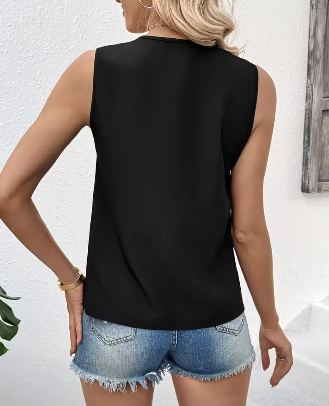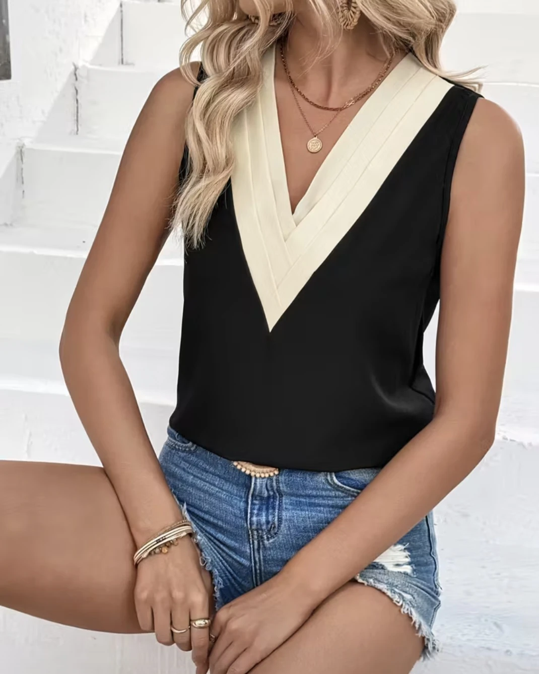 This sleeveless V-neck top features a chic contrast collar. It's made from a lightweight fabric. A great layering piece for warmer weather!