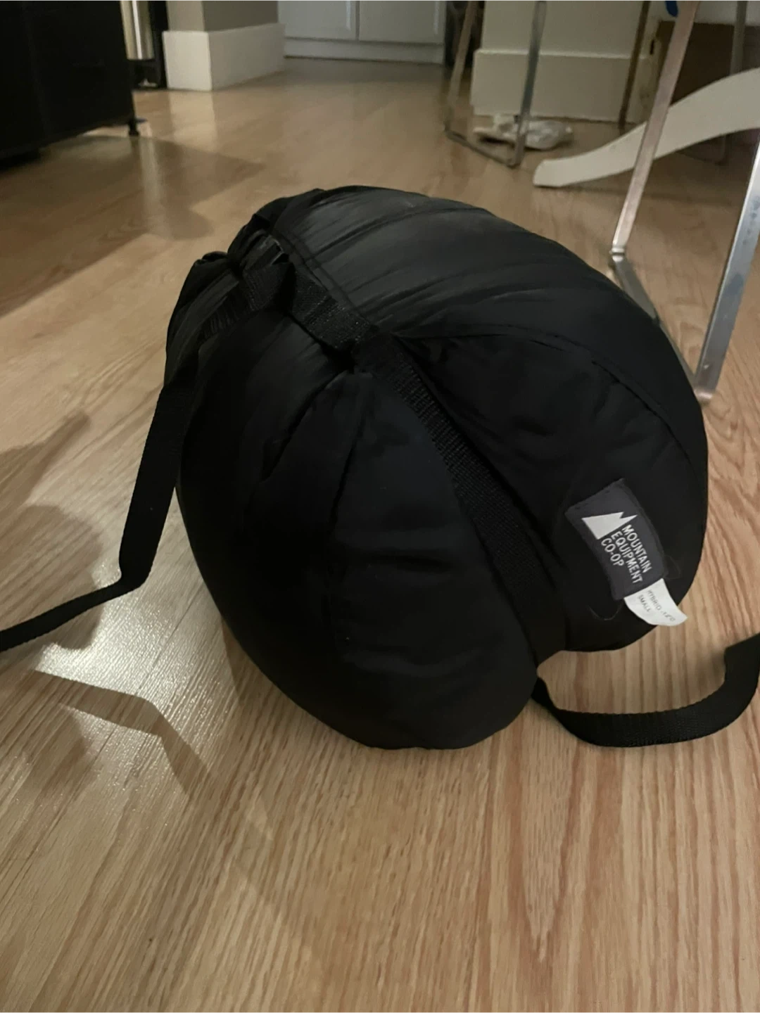 This is a black Mountain Equipment Co-op sleeping bag. It's a small size, ideal for camping trips. It's green on the inside and includes straps for packing.