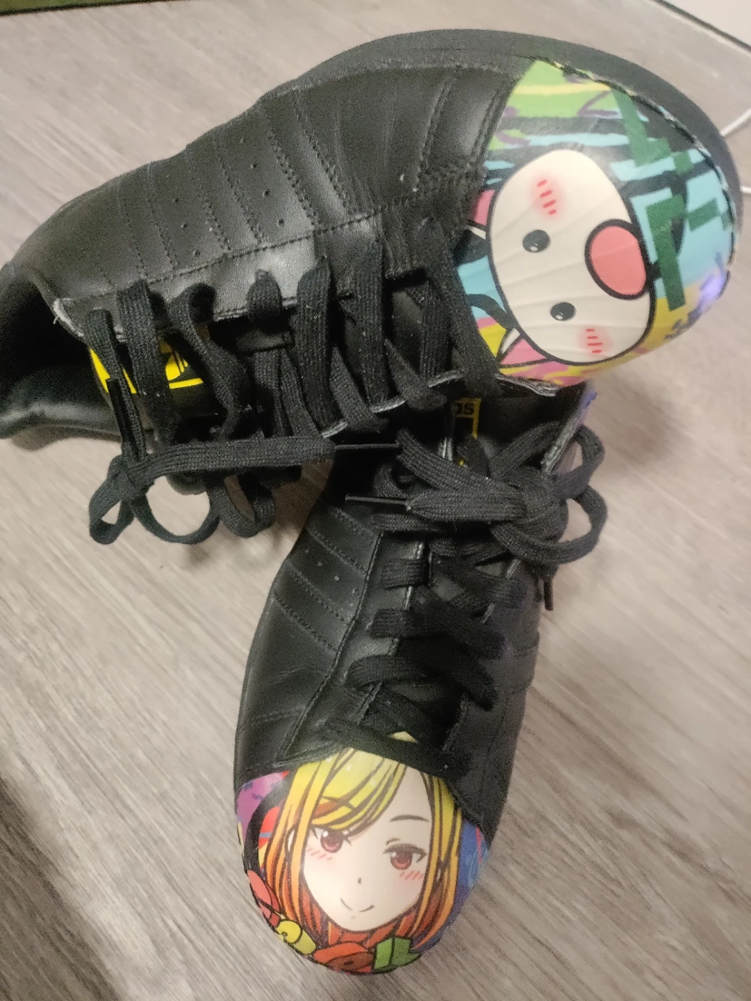 Black Adidas Superstar sneakers with anime-style cartoon graphics on the shell toes. These shoes feature the iconic three stripes and shell toe design. Leather upper.