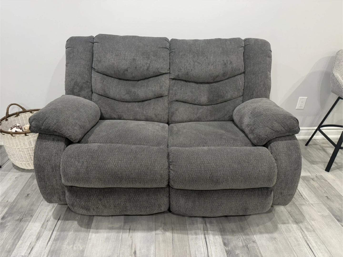 Unused and comfy Ashley grey loveseat recliner. It's upholstered in a soft fabric.