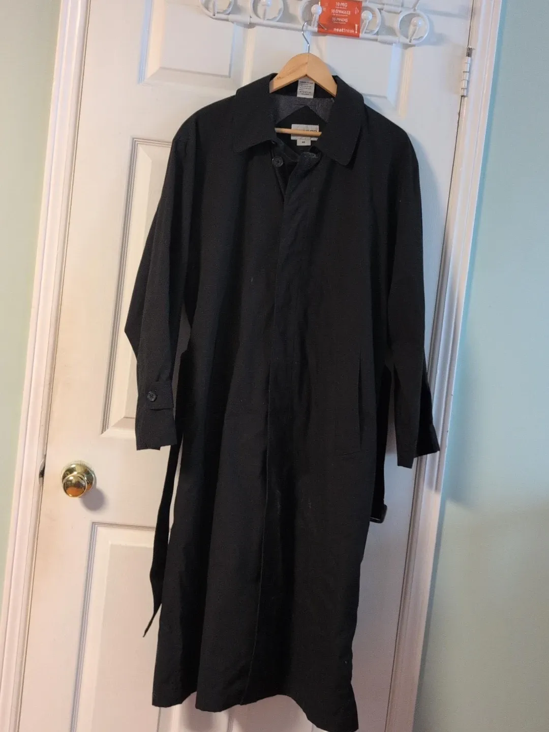 A classic black trench coat from J.Crew. It's made of a durable material with a belt tie. This coat is great for layering over outfits.