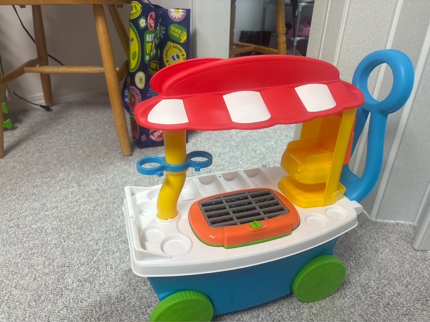 This colourful play grill cart is perfect for little chefs. It features a red and white striped awning and a grey grill grate with an orange trim. Includes a blue handle and green wheels for easy movement. Pick up cash only