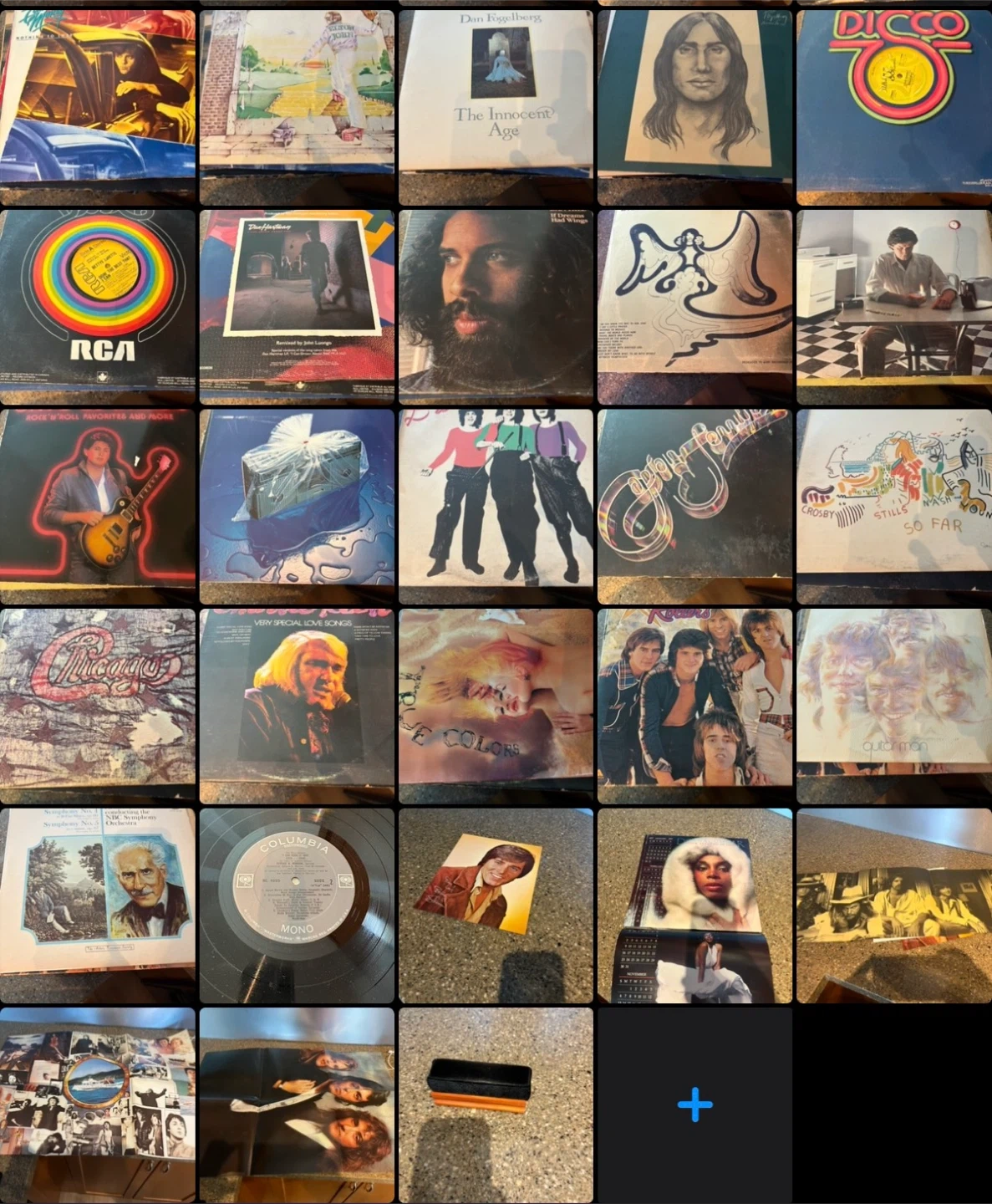Big mixed vinyl lot with classic rock, pop, disco, jazz, classical, soundtracks, kids’ records, and a few vintage 45s. Includes poster inserts and a record brush.