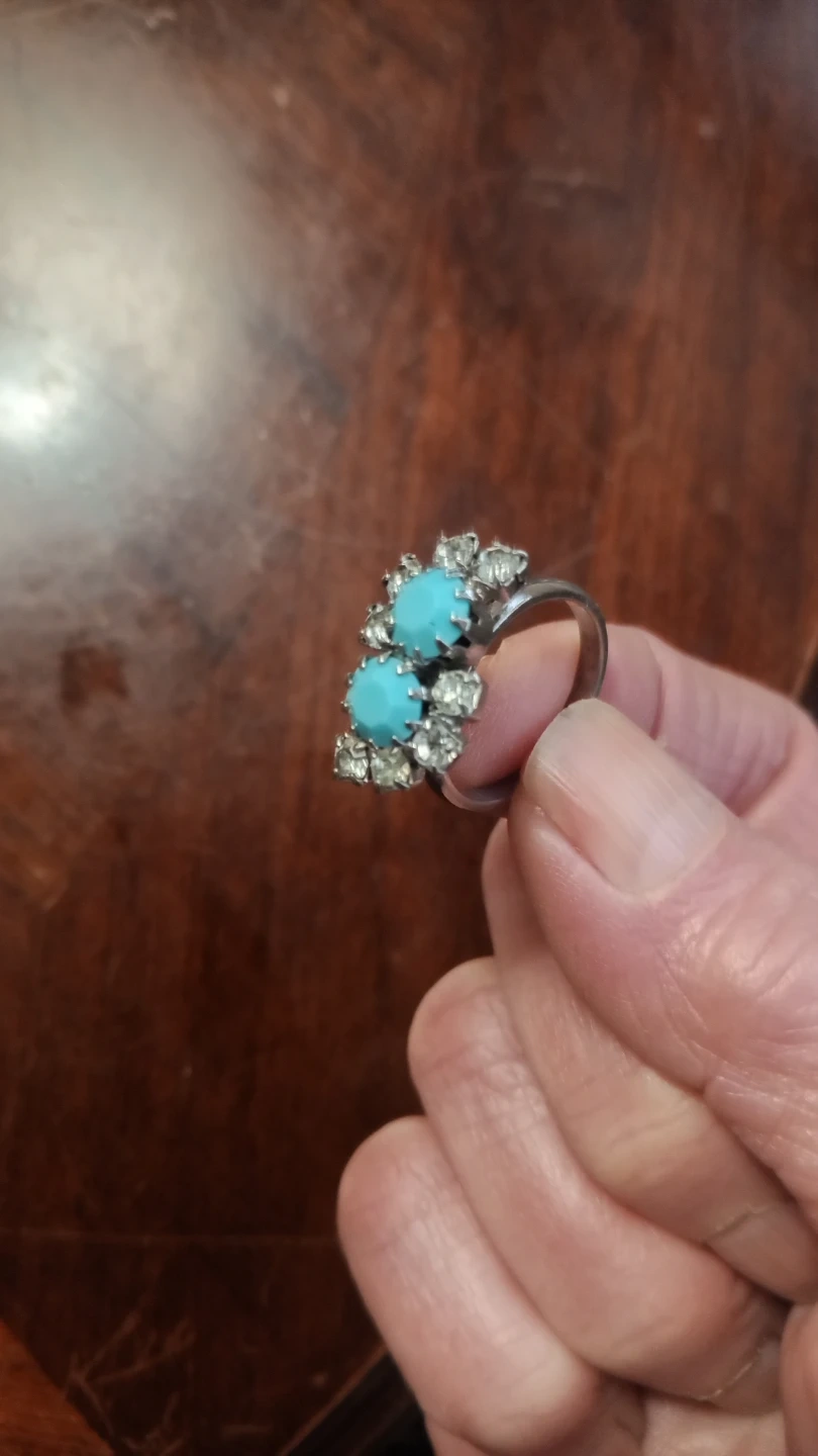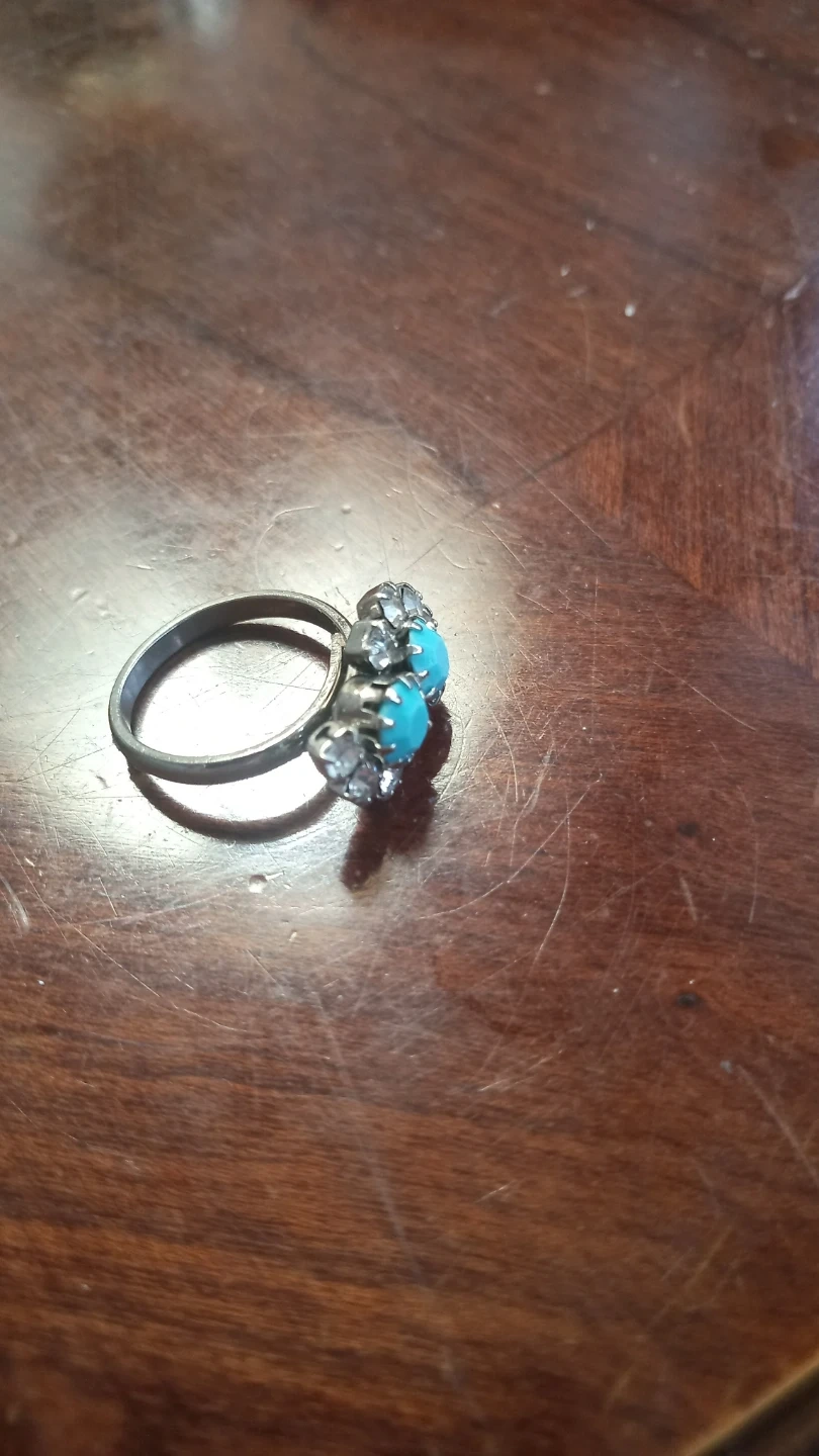 Selling a vintage ring featuring turquoise stones surrounded by rhinestones. It's in good condition and ready to add a touch of retro charm to your collection