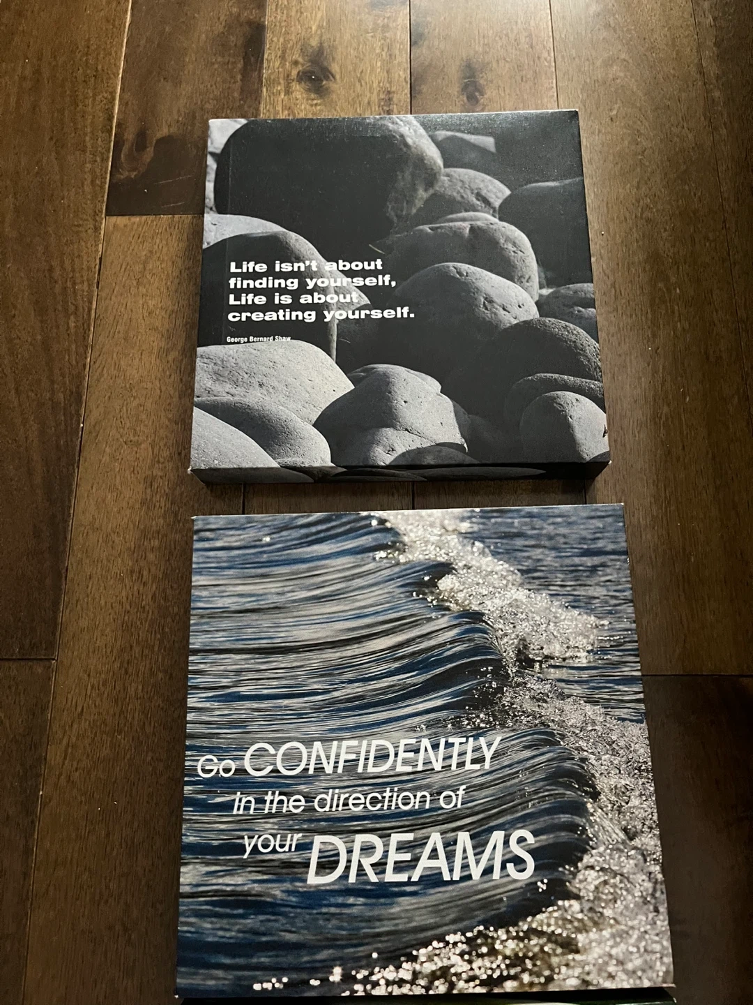 Selling a set of three canvas prints. They feature different designs: rocks, waves, and a flower. They'd be a nice addition to any room!
