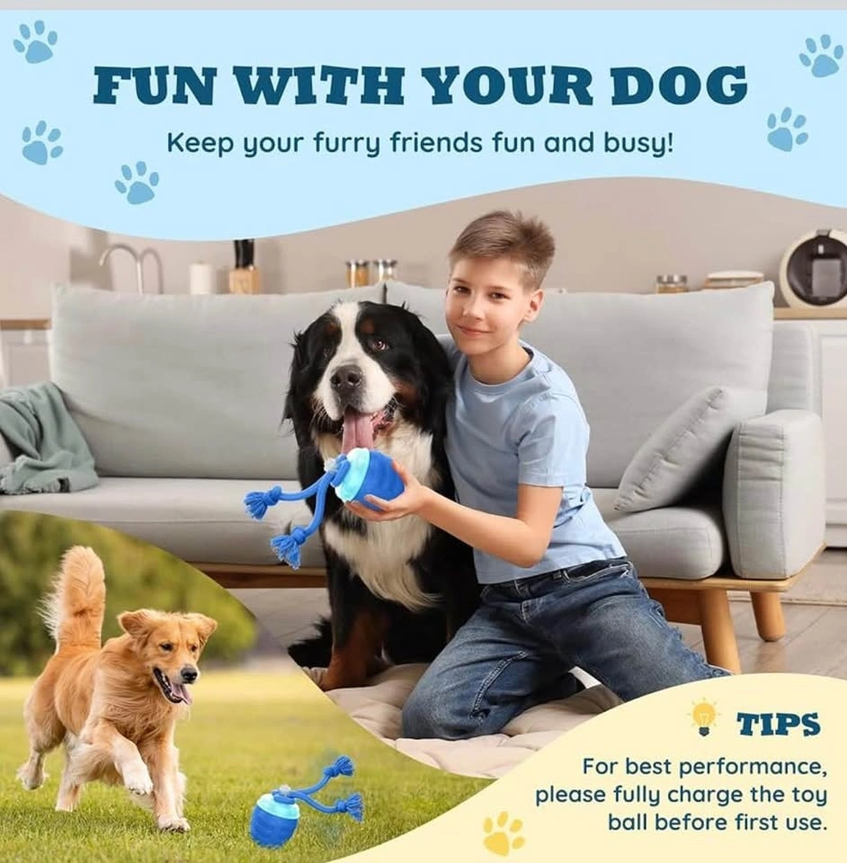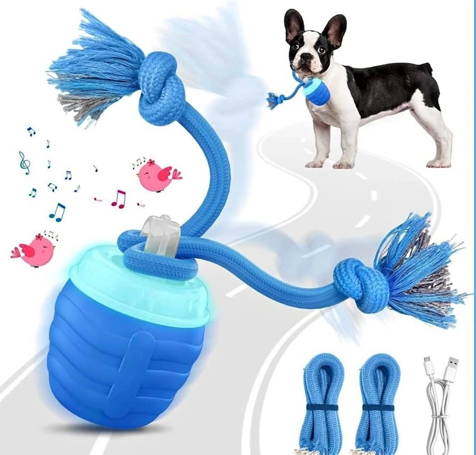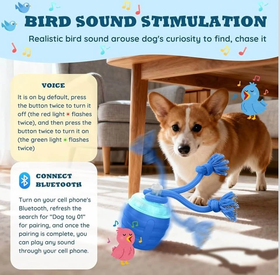 This interactive dog toy provides fun playtime for your pet. It rolls in erratic patterns and has built-in audio functions like chirping bird sounds and Bluetooth for music. It's motion-sensing and activates with a touch. For best results, fully charge the ball before first use. To turn off the bird sound, press the button twice (red light flashes twice). To turn it back on, press twice again (green light flashes twice). It has three modes: fast rolling (blue light), slow wandering (purple light), and interactive mode (green light). You can switch modes by short-pressing the power button. It works well on carpets, hardwood, and tile, indoors and out. To access the power button, unscrew the outer shell. Press once to turn on (fast mode). For Bluetooth, enable it on your phone and select 'Dog toy 01' to pair. You can then play any sound from your phone. To mute the toy, quickly press the power button twice. The toy is USB rechargeable via Type-C cable (adapter not included) and takes about 2 hours for a full charge. It's great for birthdays and holidays, helping to keep dogs busy and alleviate boredom or anxiety. Package includes: 1 Smart Dog Ball, 2 Long Ropes, 1 Type-C USB Cable, 1 User Manual.