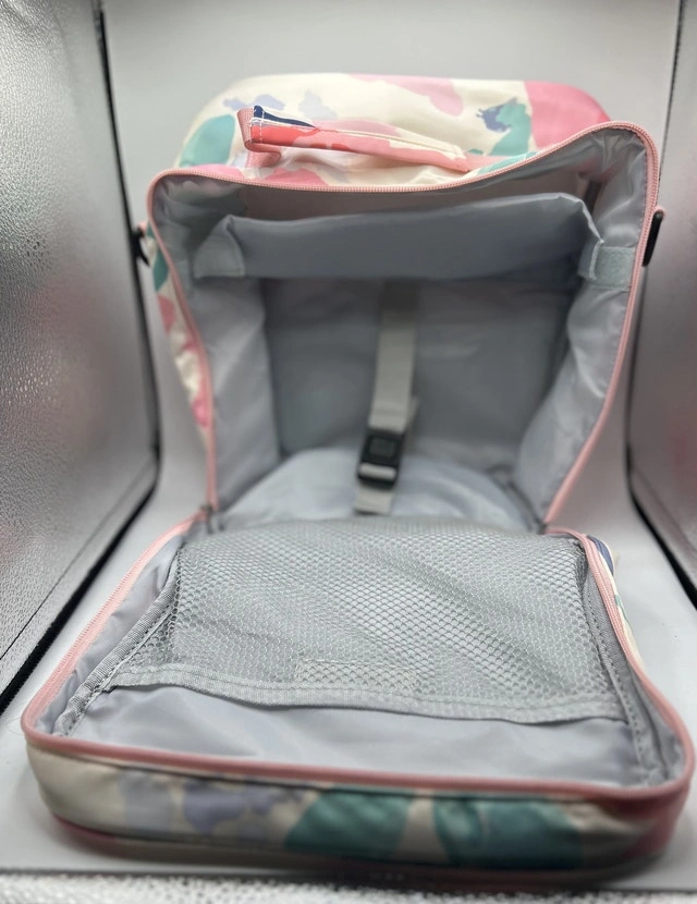 Spacious Compartment: Large main compartment, mesh pocket on the lid, belt to secure your lunch container, separation compartment in the base.