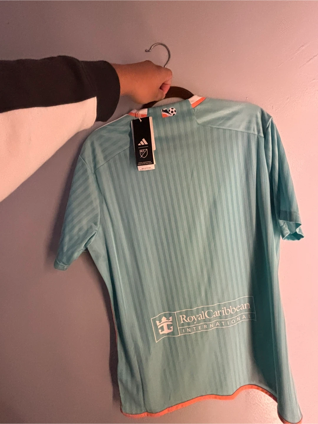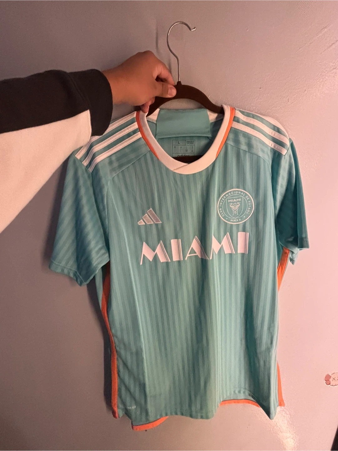 This is an Adidas Inter Miami CF soccer jersey. It's a size large and features the Royal Caribbean International logo on the back. The jersey is light blue with orange accents and has the team's crest on the front.