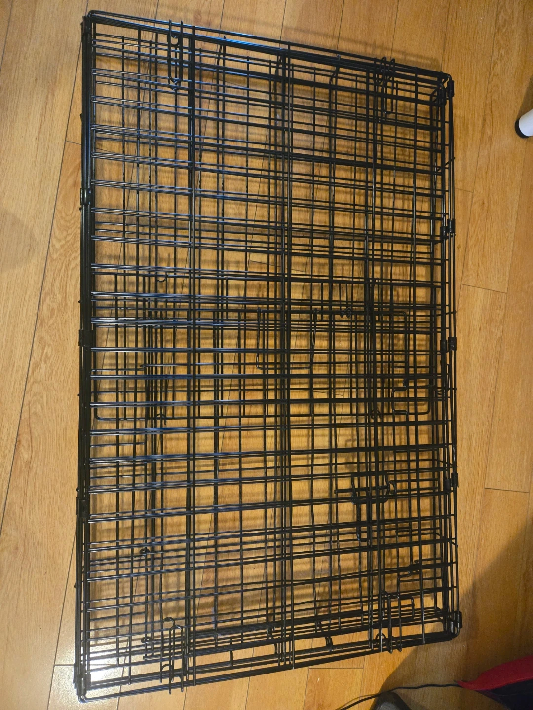 Black wire dog crate with removable plastic tray. It is 22.5" wide, 24" tall, and 36" long so it is suitable for small to medium sized dogs. The crate folds flat for easy storage.