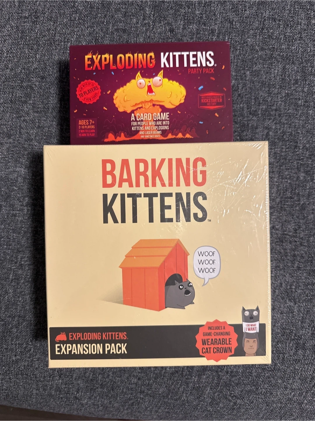 Original exploding kittens party pack (lightly used) with BNIB Barking Kittens expansion pack. It's a card game for ages 7+ and includes a wearable cat crown.
