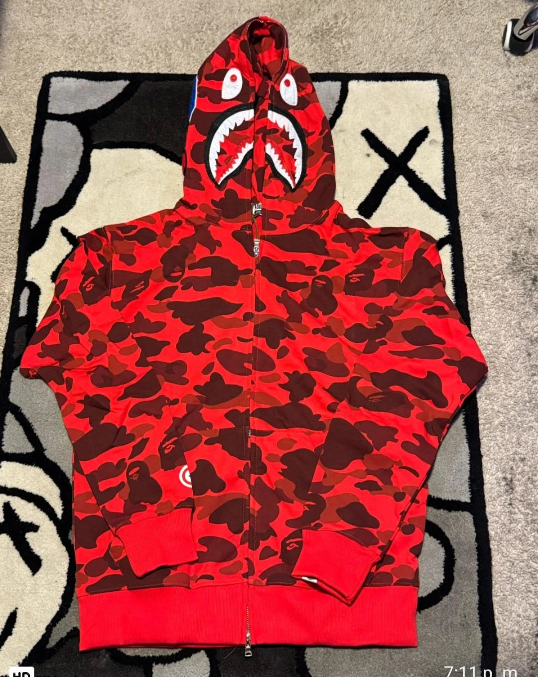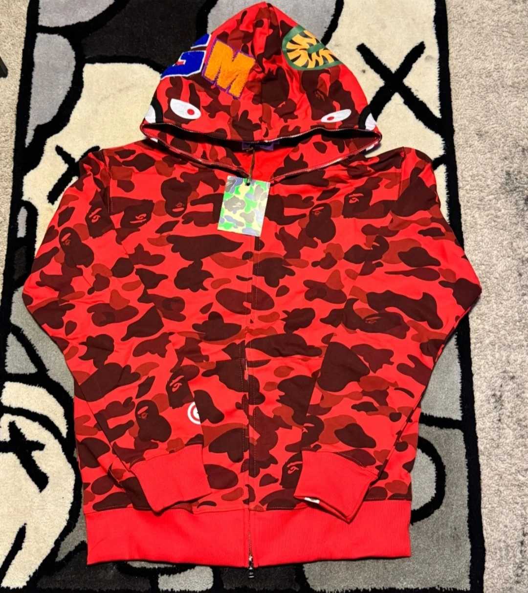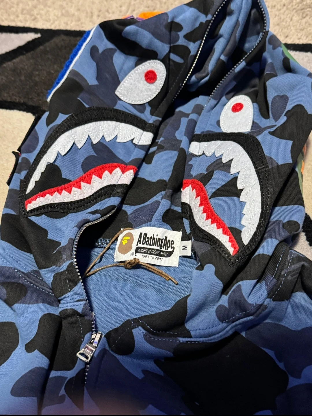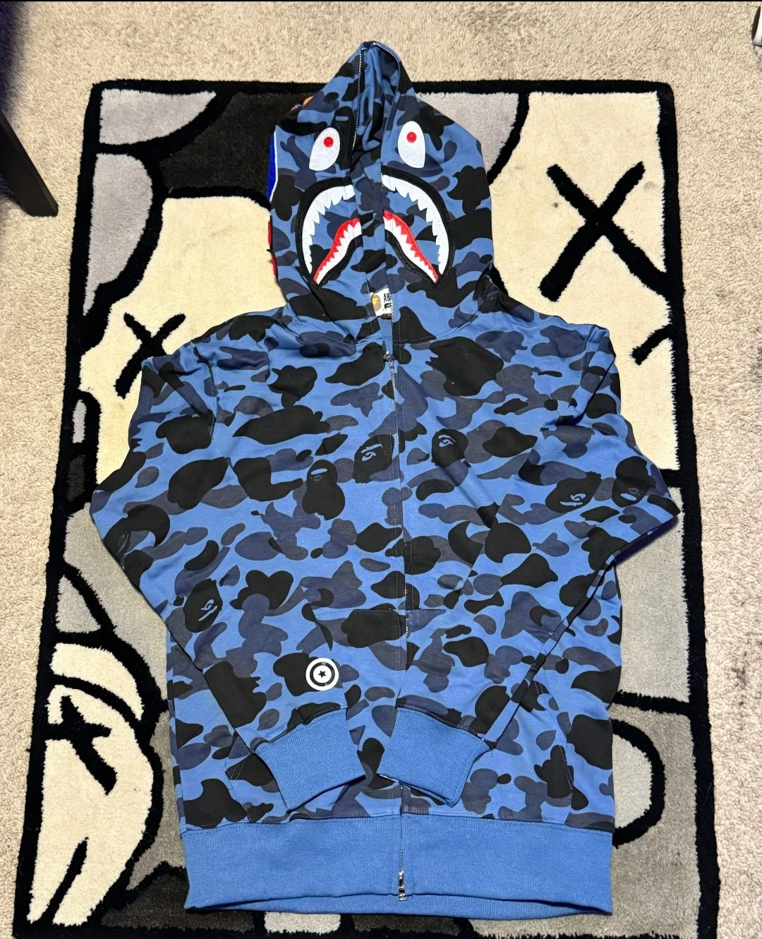 A Bathing Ape shark full zip hoodie in blue camouflage. Features the iconic shark graphic on the hood. Made of comfortable material for everyday wear.