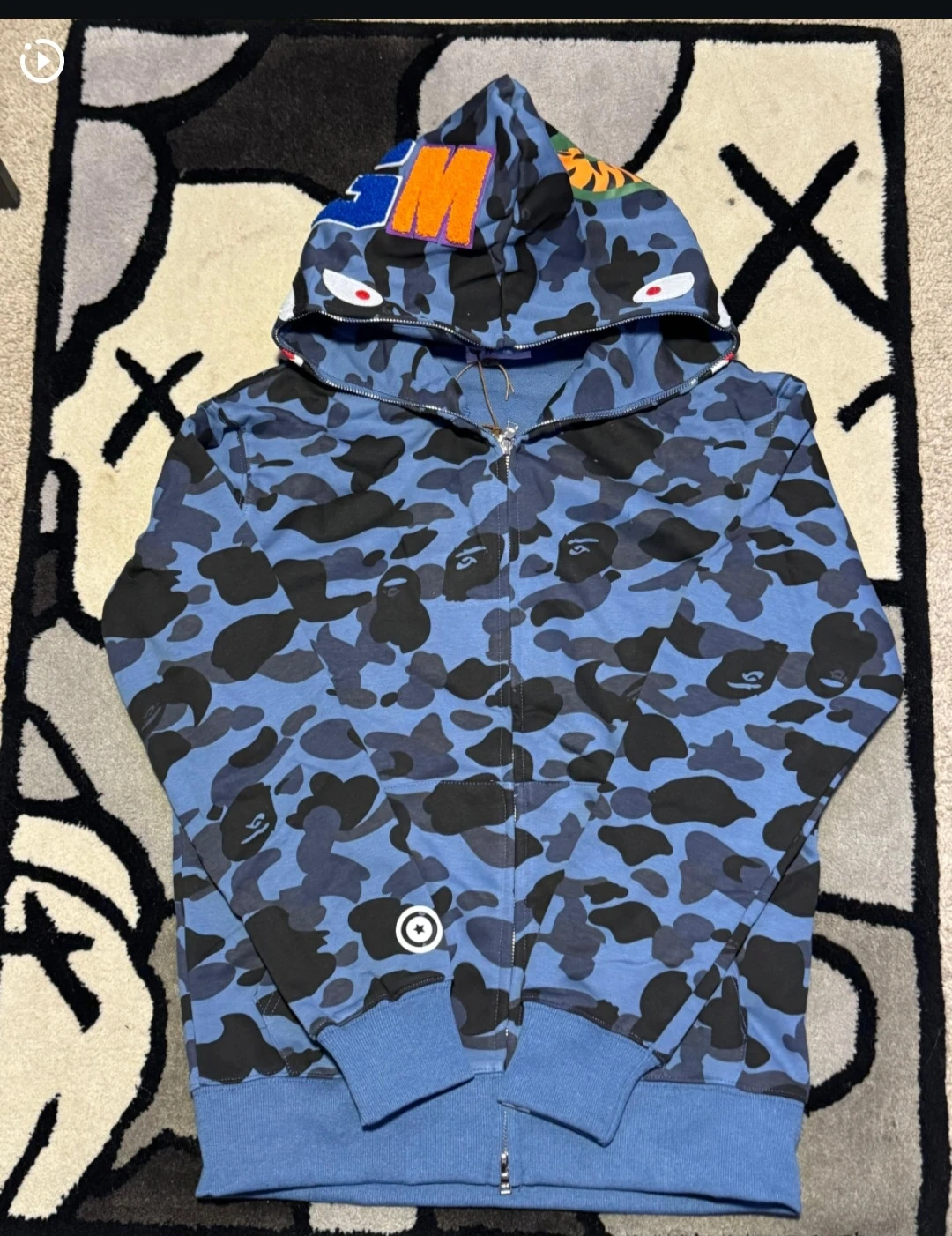 A Bathing Ape shark full zip hoodie in blue camouflage. Features the iconic shark graphic on the hood. Made of comfortable material for everyday wear.