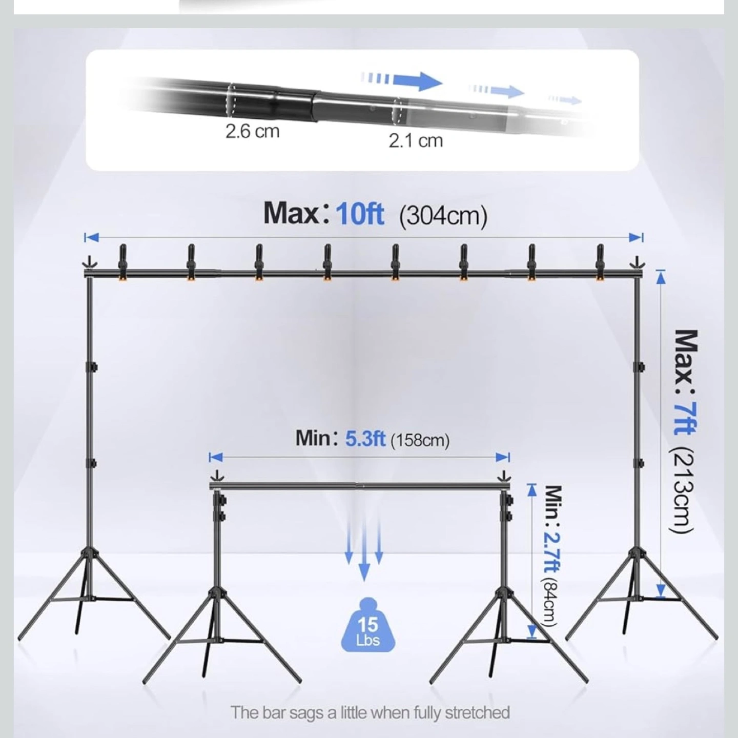 This Emart photo and video studio backdrop stand kit is perfect for setting up professional-looking shots right at home! The kit includes the stand, clamps, and sandbags, all in a convenient carrying case. It can extend up to 10ft (304cm) wide and 7ft (213cm) tall, making it versatile for different setups. The minimum height is 5.3ft (158cm) and 2.7ft (84cm). It can hold up to 15 lbs