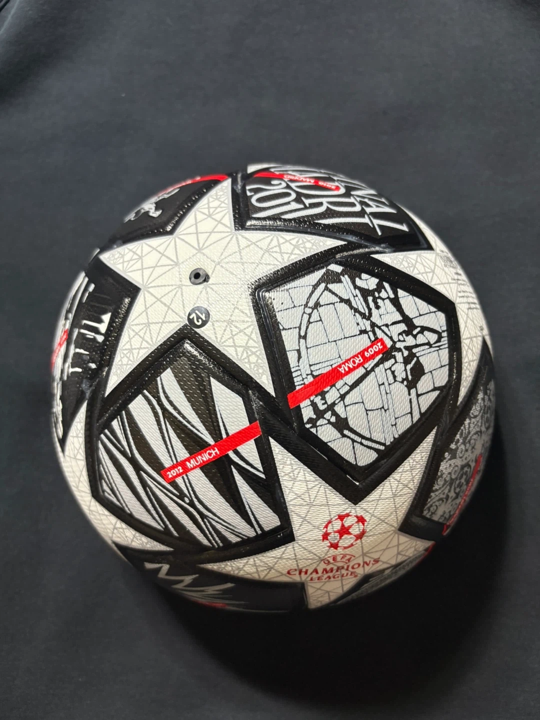 Selling an Adidas Champions League soccer ball! It features a unique design with panels showcasing different Champions League finals. There are some signs of use, but it's still in good condition for play or display